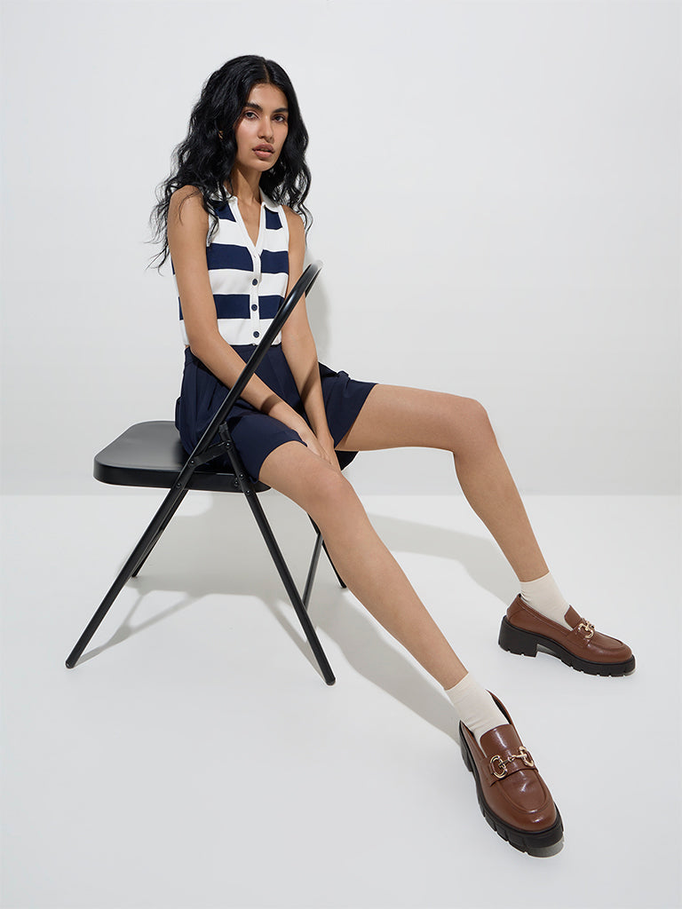 Nuon presents this ribbed-textured navy top in a stripes profile. Crafted from a lightweight fabric. it includes a shirt collar that extends to a buttoned placket and a sleeveless cut.