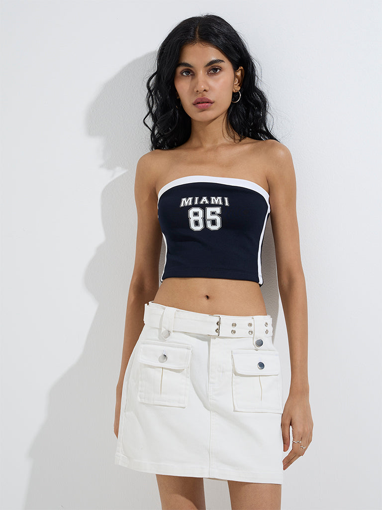 This navy tube top from Nuon showcases a bold mix of text and number graphics for a contemporary edge. Made from a super-soft t fabric. it provides a breathable fit ideal for both casual outings and layered looks.