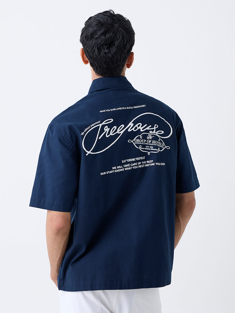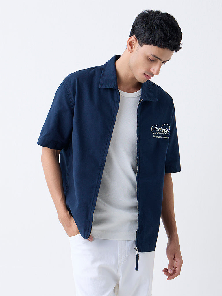 Nuon Navy Text Embroidered Relaxed-Fit Cotton Jacket