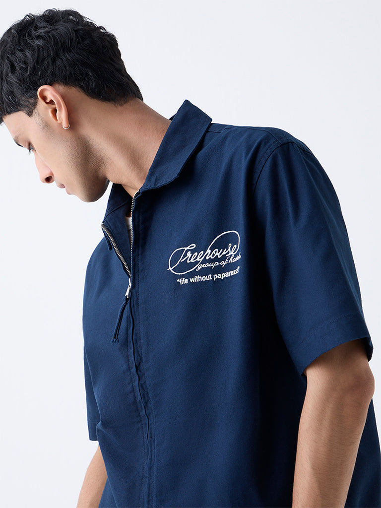 Nuon’s navy relaxed-fit jacket stands out with striking text embroidery across the front and back. Designed with a spread collar and a ziplined front. it features short sleeves and two inner pocket. combining modern streetwear appeal with practical detailing.