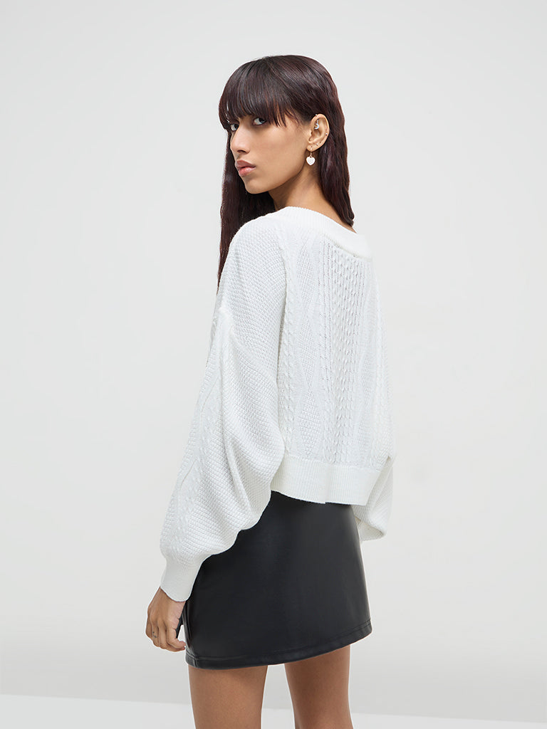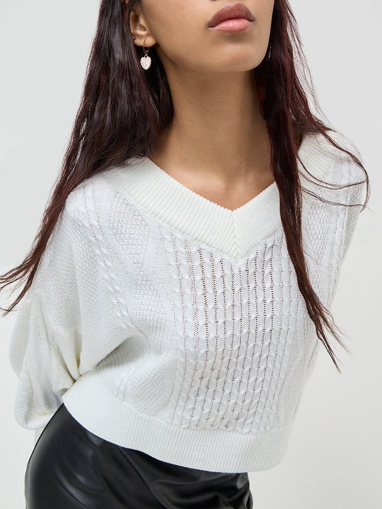 This off-white sweater from Nuon highlights cable knitted embroidery for sumptuous comfort. Crafted from a breathable fabric. it includes a V-neck and dropped sleeves.