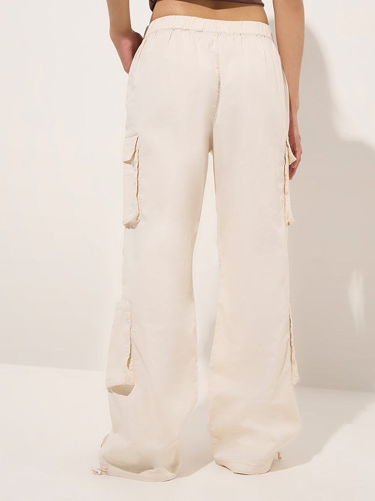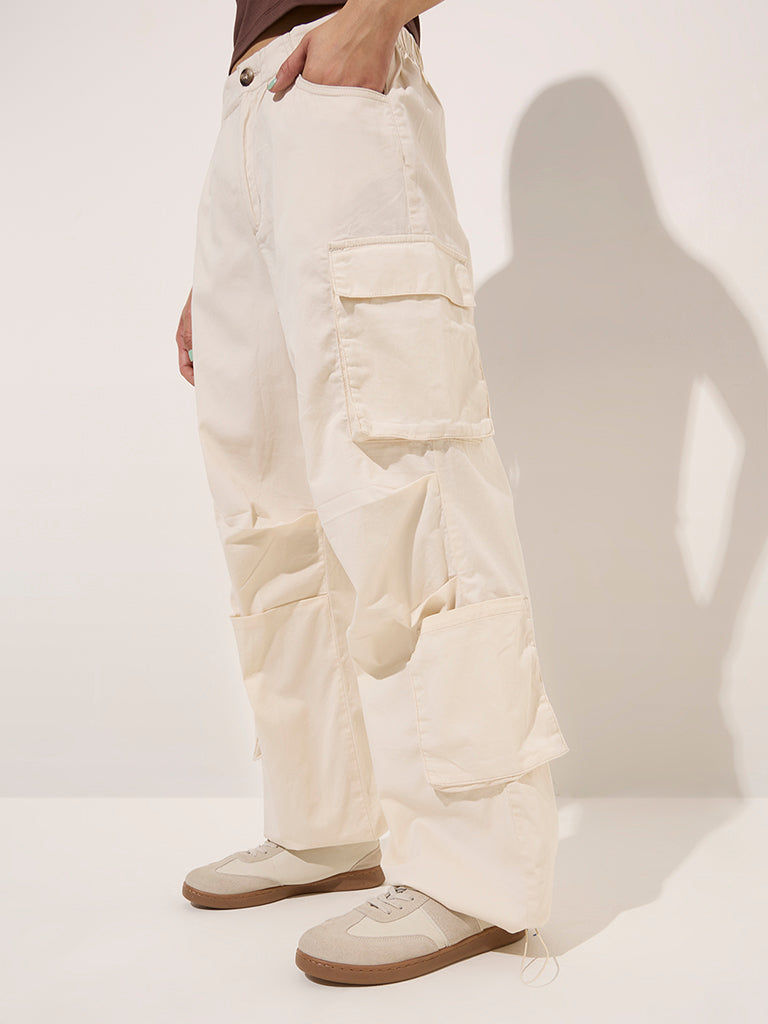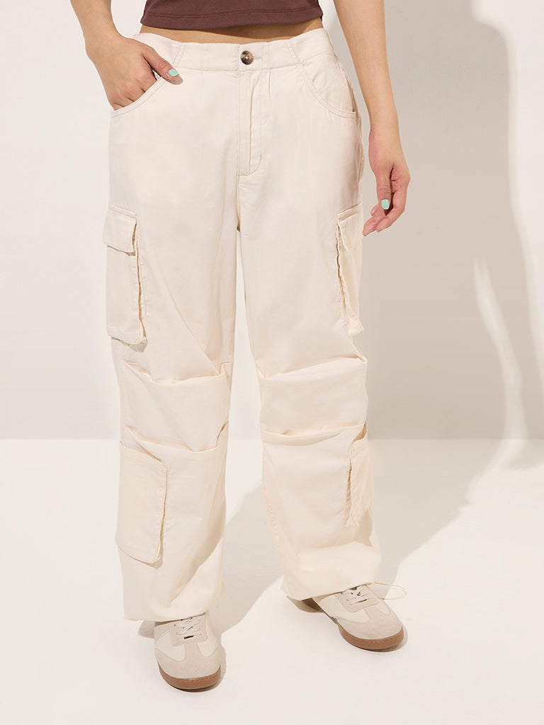 Off-white trousers from Nuon designed in a cargo profile. Made from a cotton-rich fabric. the high-rise pair is complete with an elasticated waistband. button-zipper fly. belt loops. and multiple pockets.