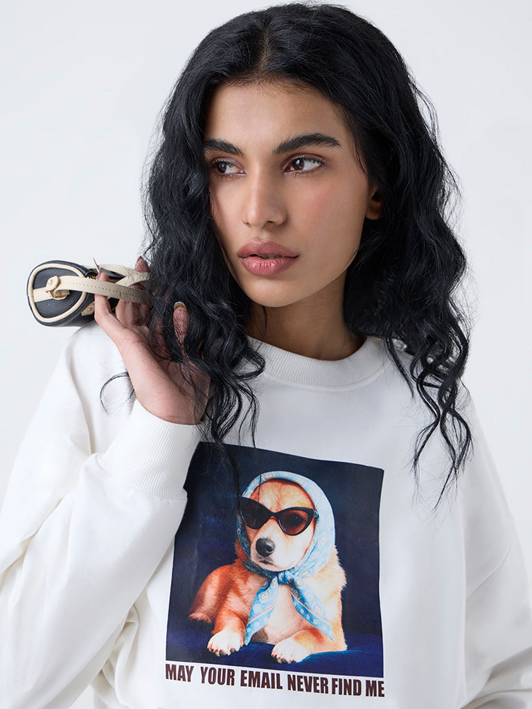 A fun pick for easygoing days. this off-white Nuon tee shows off a quirky dog graphic that adds instant charm. Crafted from a comfortable fabric. it features a crew neckline. dropped sleeves. and an elasticated drawstring waist that lets you cinch the fit the way you like it.