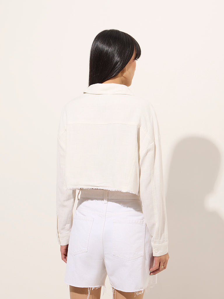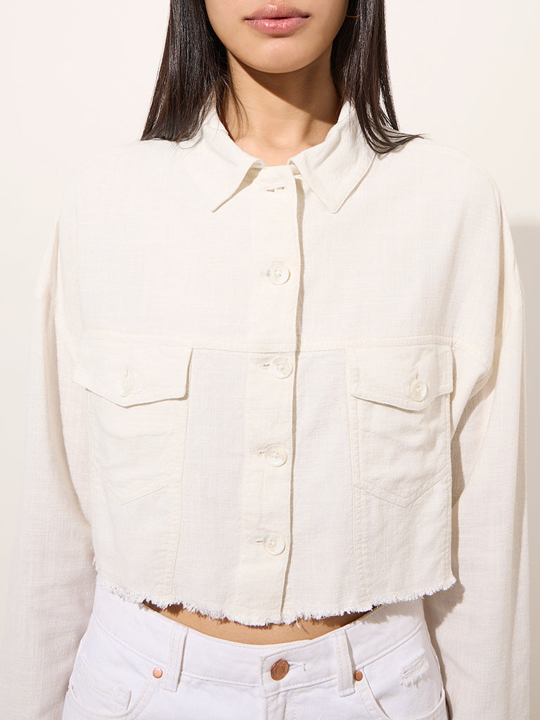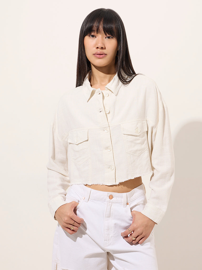 This off-white jacket from Nuon is made from a blended linen fabric for sumptuous comfort. It includes a semi-spread collar that extends to a button placket and full sleeves.
