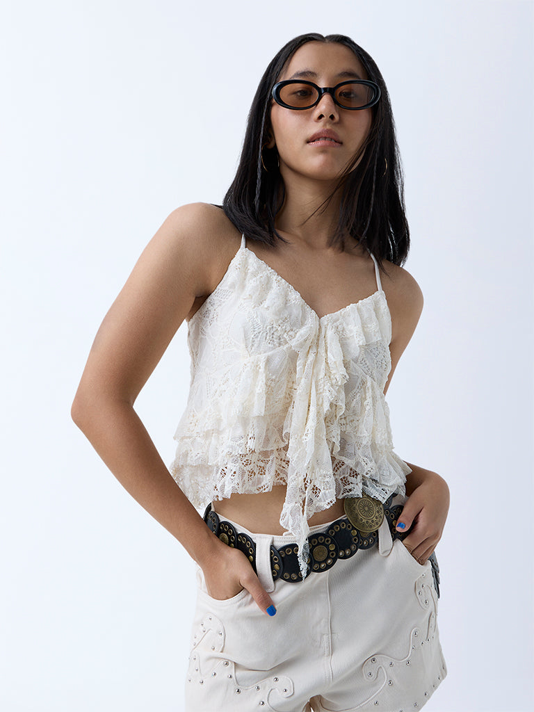 This off-white top from Nuon brings a romantic touch to contemporary styling with its ruffled layers set against an exquisite lace base. The lightweight fabric creates a soft. dimensional feel. while the V-neckline and adjustable straps offer a flattering fit. A criss-cross detail at the back adds unexpected charm. making it a standout choice for casual outings or evening plans.