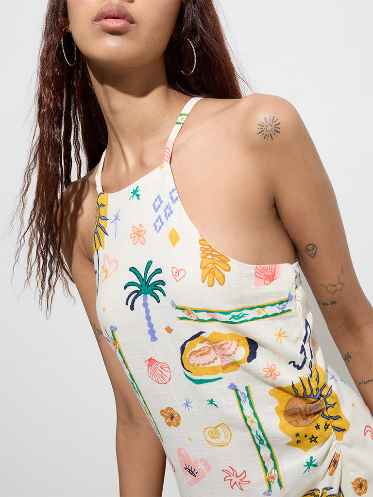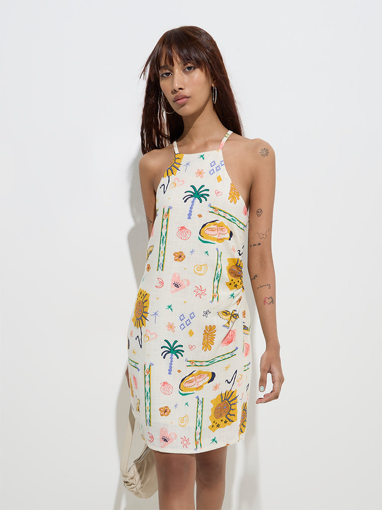 This off-white dress from Nuon is adorned with nature-inspired patterns for a stylish appeal. Crafted from pure cotton for a breathable feel. it features a square neckline and adjustable shoulder straps that crisscross at the back. adding a trendy finish.
