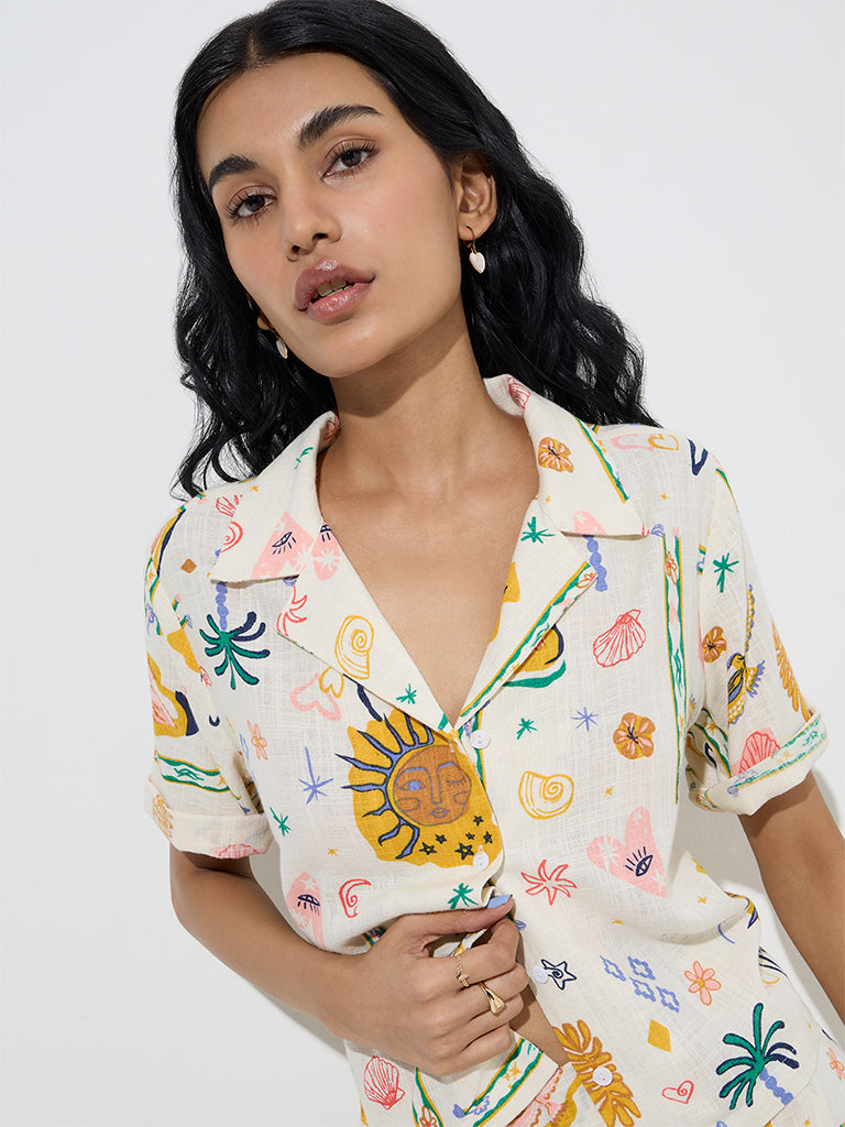Showcasing playful sky motifs. this off-white shirt from Nuon is crafted from a sumptuous linen-blend fabric for a breezy feel. Designed with a notched collar. it flows into a classic button-up front and short sleeves. making it a perfect pick for laid-back days.