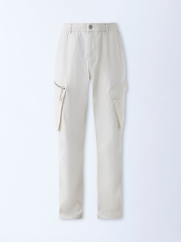 Cut for ease and movement. these off-white pants from Nuon are shaped in a relaxed profile. Crafted from a soft cotton-blend fabric. they feature an elasticated waistband. button-zip fly. and multiple pockets for a contemporary utility-inspired look.