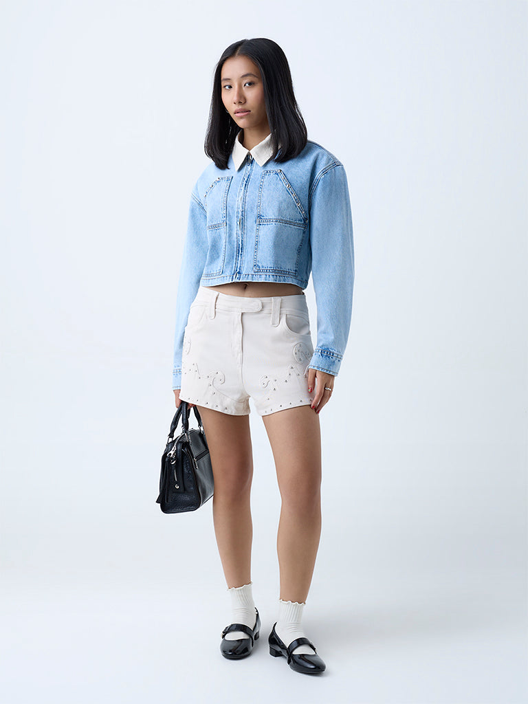 Nuon Off-White Stud Detailed Mid-Rise Denim Shorts