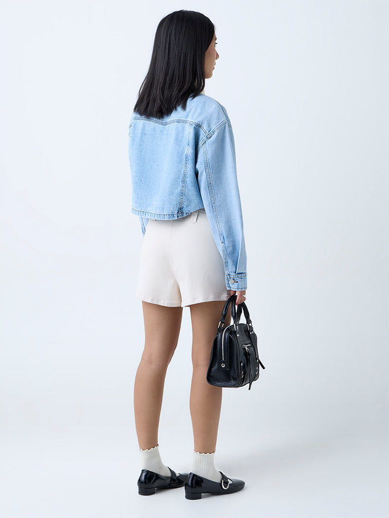 These off-white denim shorts from Nuon are elevated with stud embellishments that add a hint of edge to their clean silhouette. Crafted from a cotton-blend fabric. they feature a hook closure. belt loops. and a zipper placket for a secure fit. Multiple pockets enhance their practical appeal.