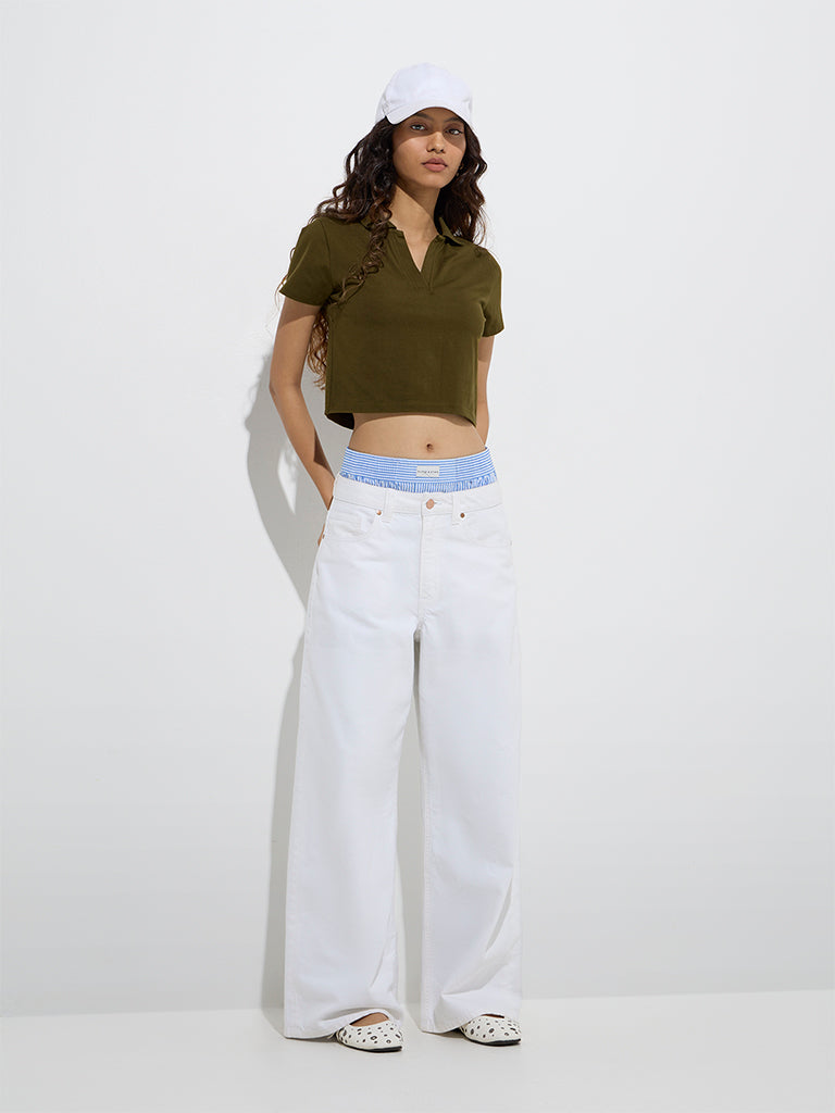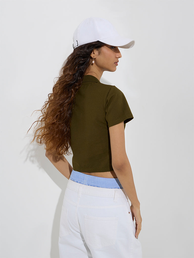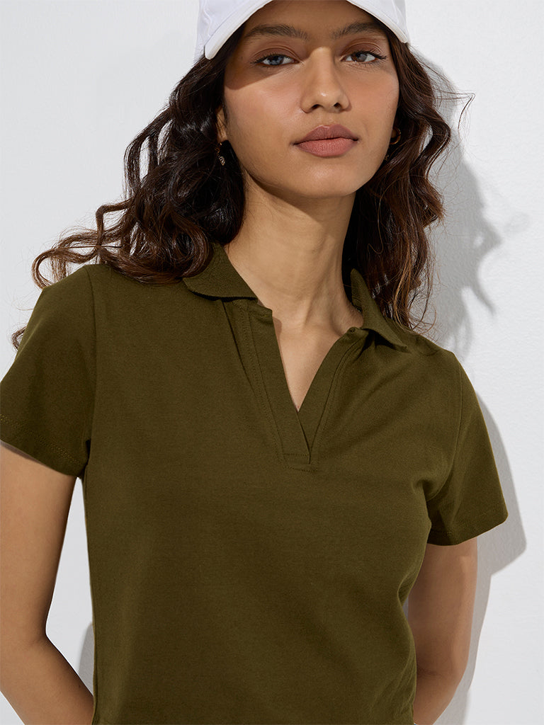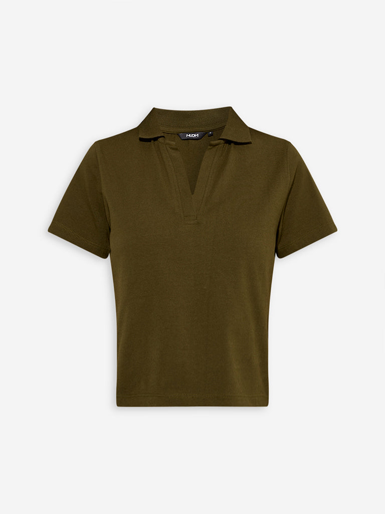 This olive t-shirt from Nuon blends casual comfort with a touch of refinement. Woven from a snug cotton-blend fabric for easy comfort. it features a collared and short sleeves.