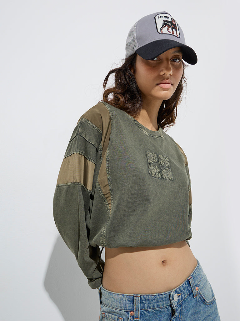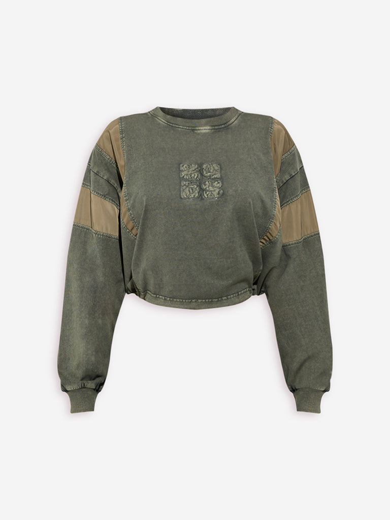 This olive denim t-shirt from Nuon stands out with its washed finish and contrasting fabric panels on the sleeves. Made from pure cotton for enhanced comfort. it features a round neck and dropped sleeves for versatile styling. The drawstring hem allows you to customize the fit. creating an edgy look that effortlessly balances casual cool with contemporary flair.