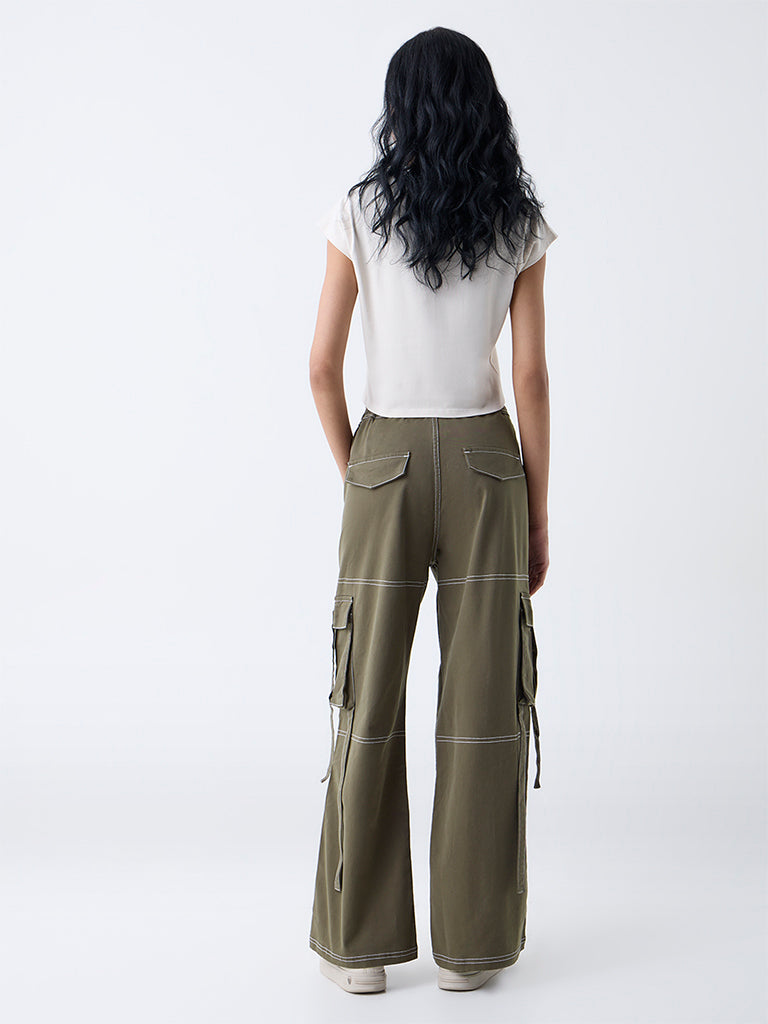 For women who like their off-duty looks to carry impact. Nuon offers these olive cargo pants. A high-rise silhouette. adjustable drawstring waist. and bold contrast stitching give them a street-ready feel. while pockets bring utility appeal.