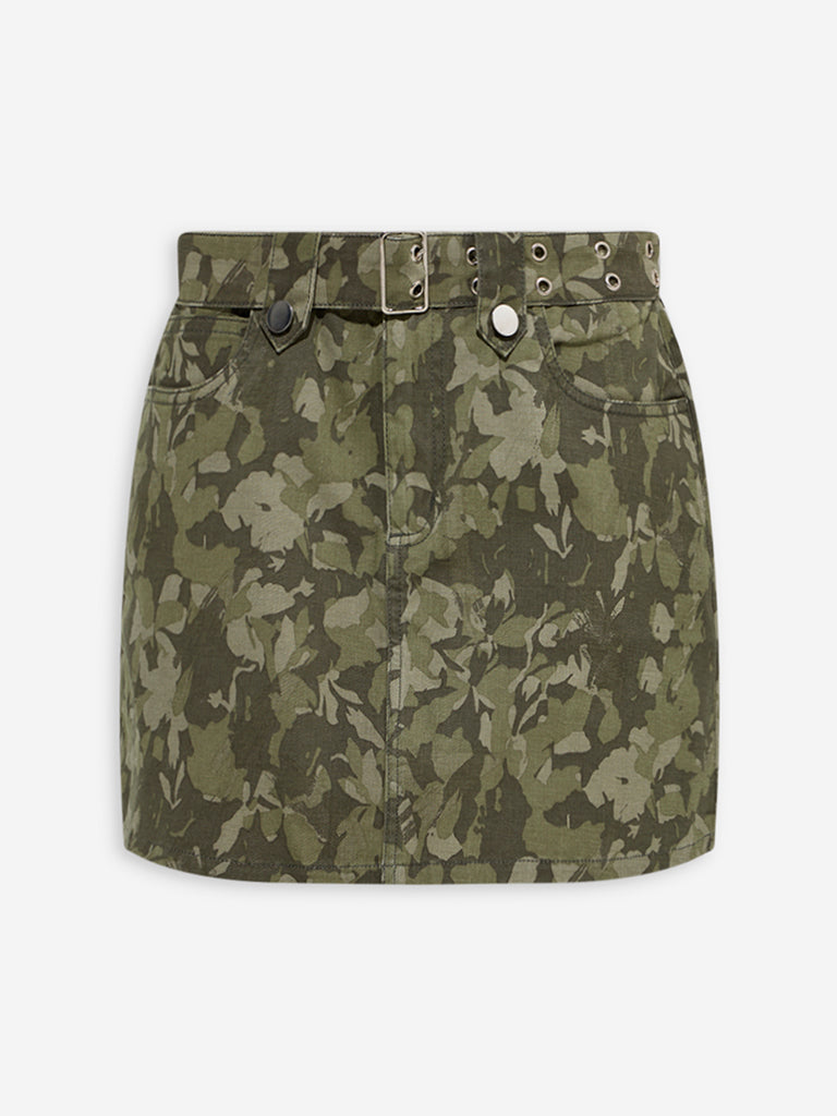 This olive skirt from Nuon channels utilitarian cool with its camouflage print. Woven from a snug cotton-blend fabric. it features a buttoned waist. zipper placket. and belt loops. complete with a matching belt to cinch the waist.