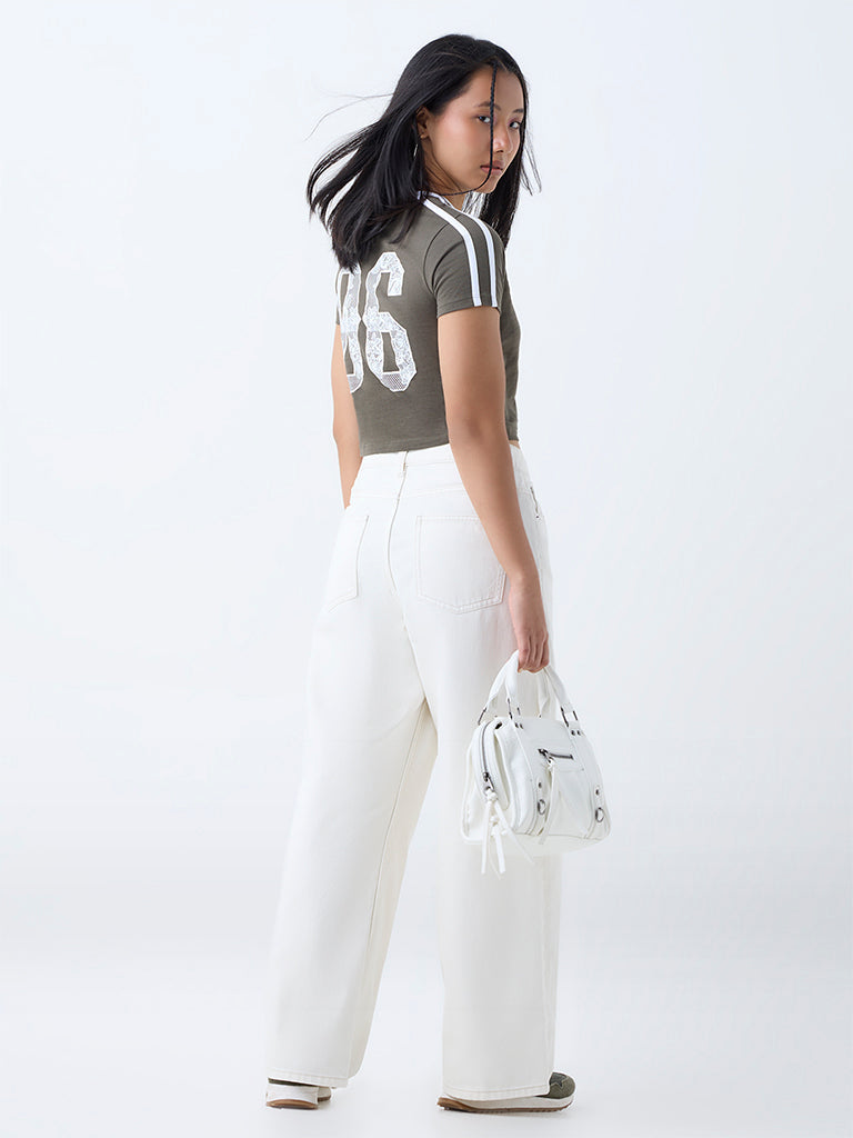 Set the tone for laid-back weekend plans with this olive t-shirt from Nuon. Crafted from a gentle cotton-blend fabric for an easy fit. it’s detailed with numerical prints and contrasting stripes along the shoulders that lend a sporty edge to its minimal silhouette. Framed with a round neck and short sleeves. it’s a versatile pick for casual outings.