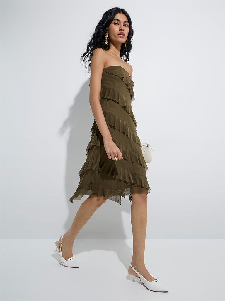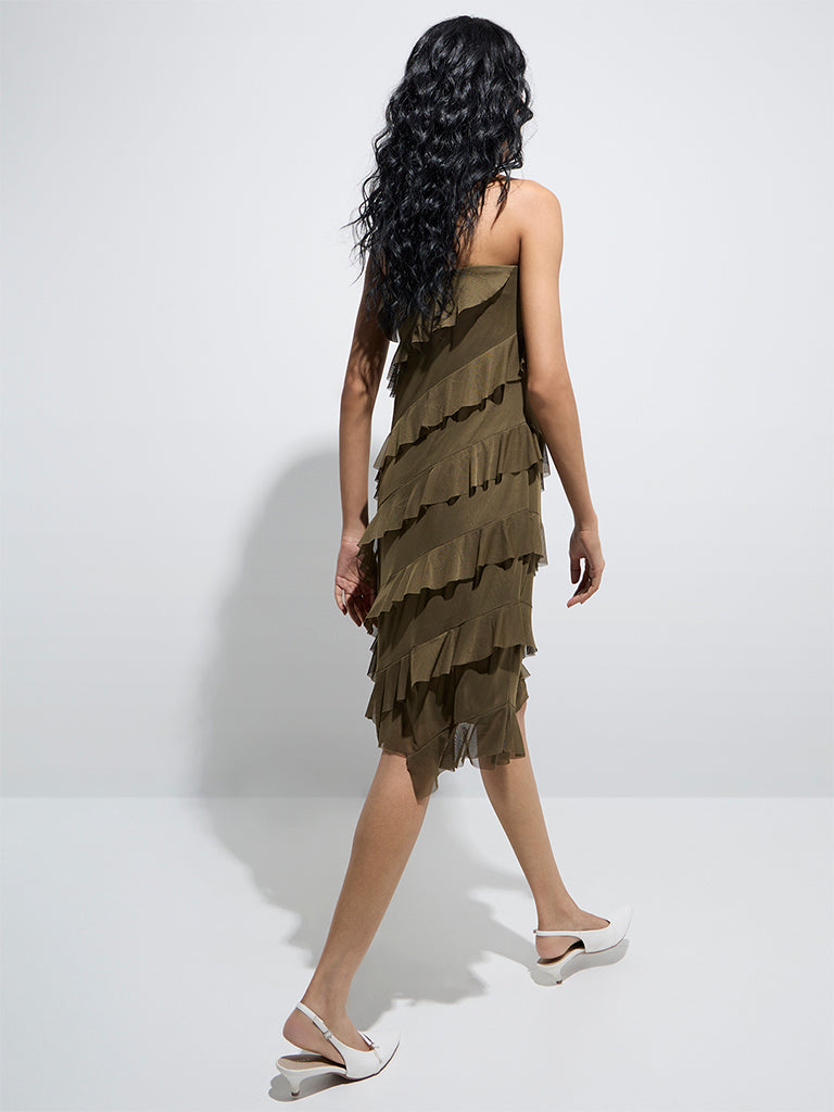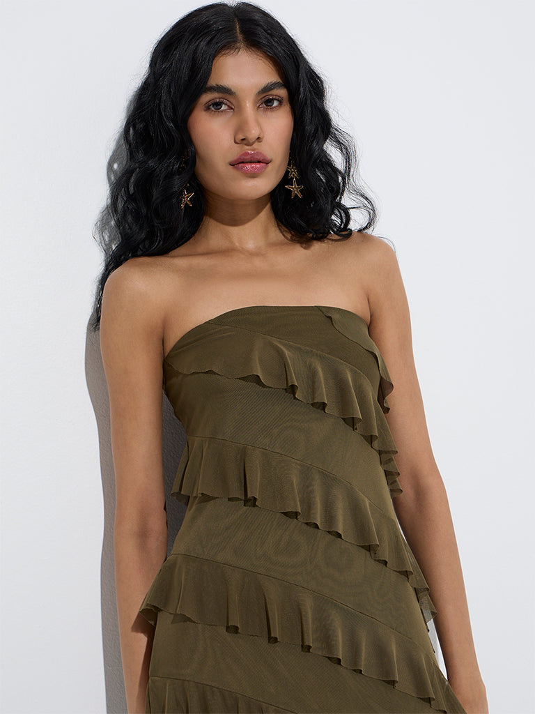 This olive tube dress from Nuon boasts cascading ruffled tiers that add effortless movement and charm. Spun from a breathable fabric. it combines comfort with a stylish silhouette.