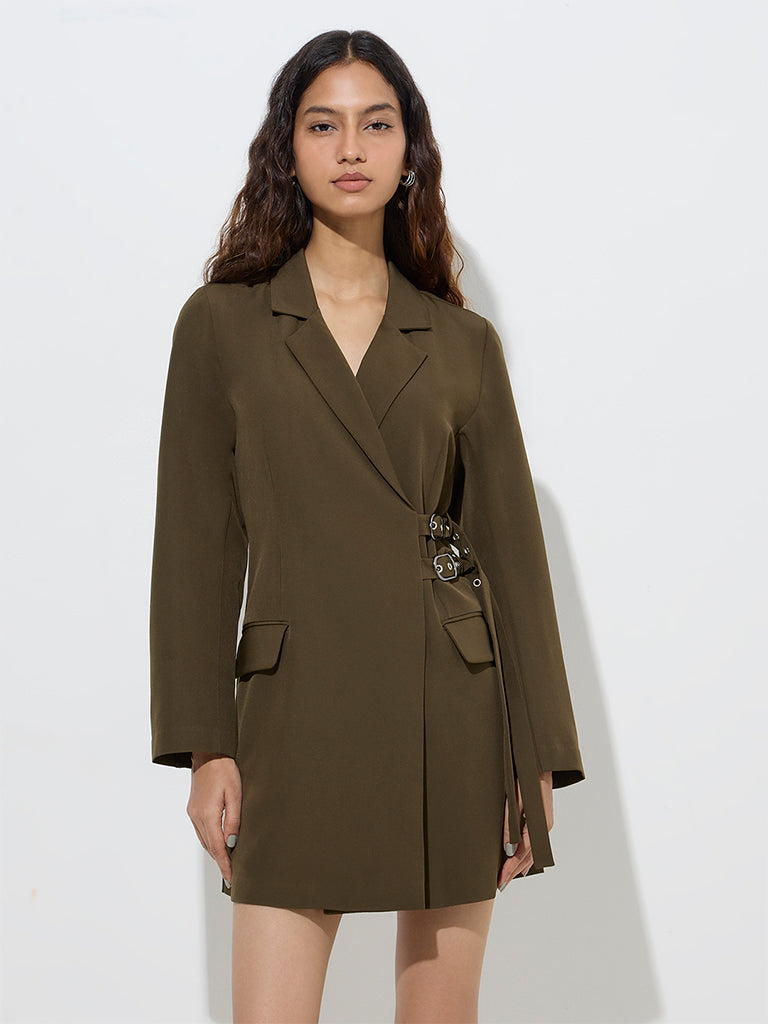 This olive A-line dress from Nuon blends sharp tailoring with a modern edge. Woven from a premium fabric. it features a notched lapel. full sleeves. and welt pockets. Buckle-detailed belts cinch the waist. adding a structured touch to the look.