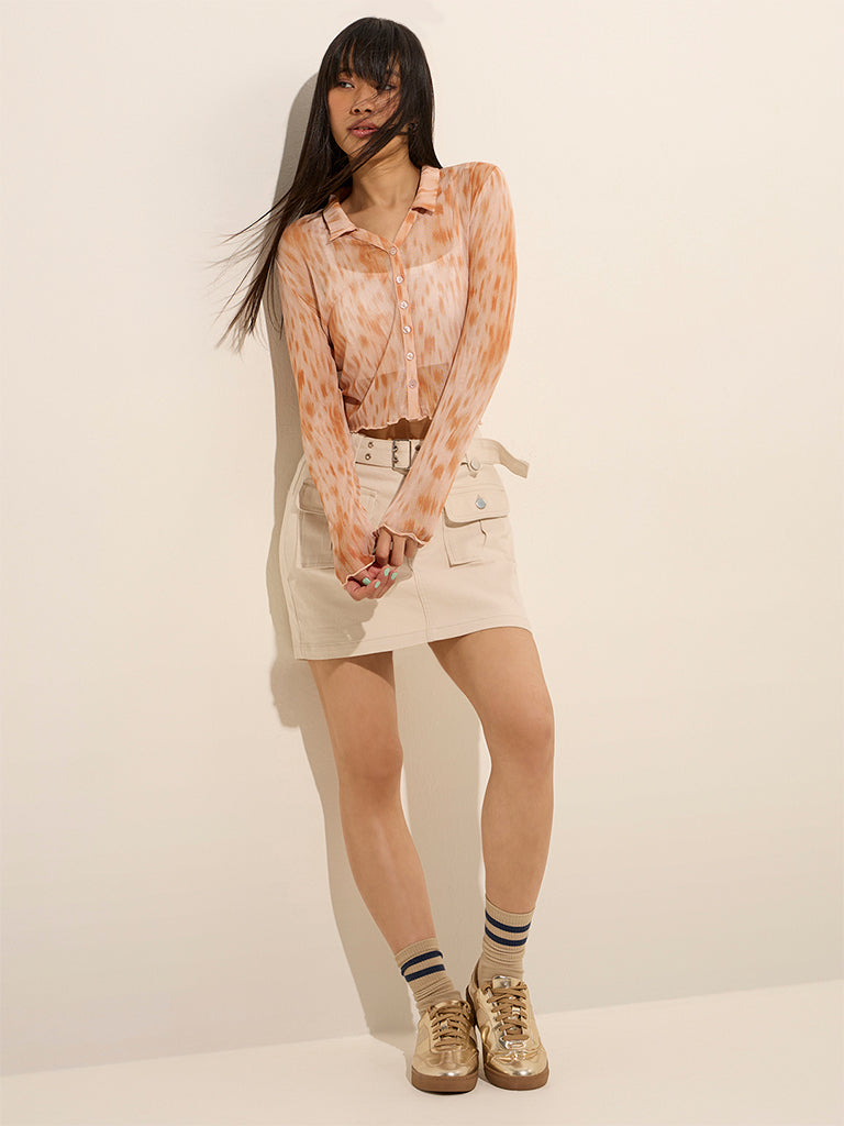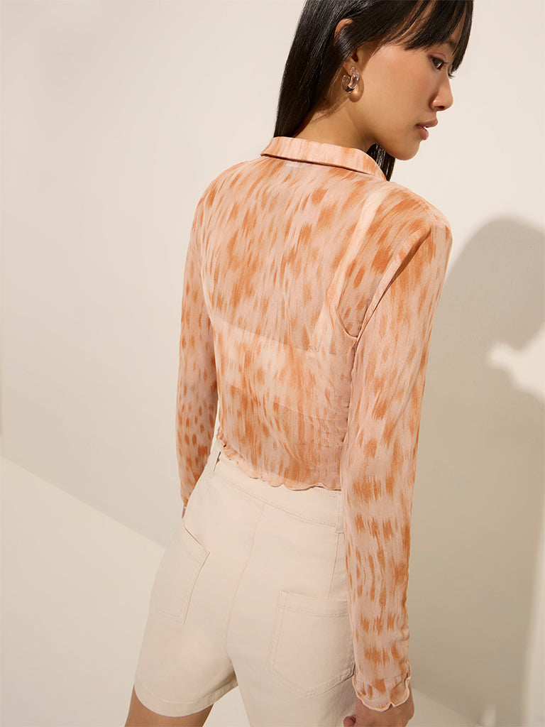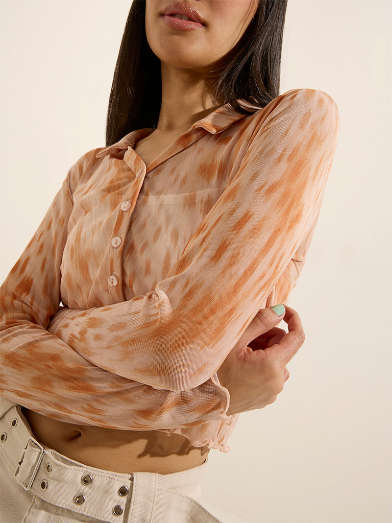 Nuon Orange Abstract Printed Mesh Crop Shirt with Inner