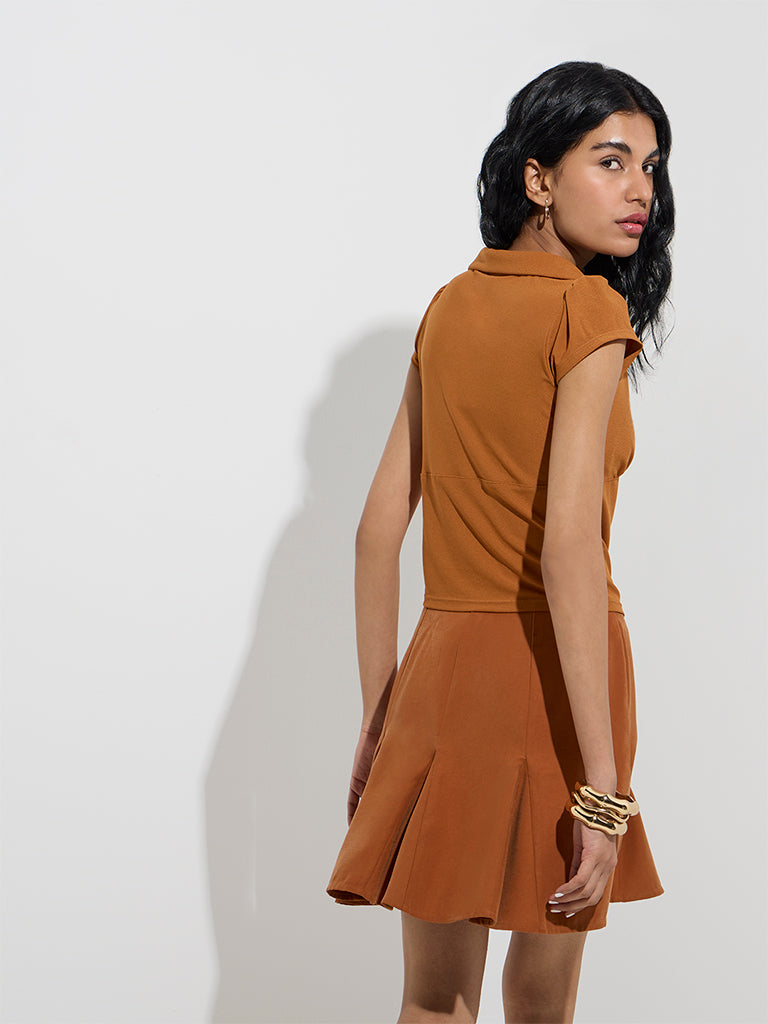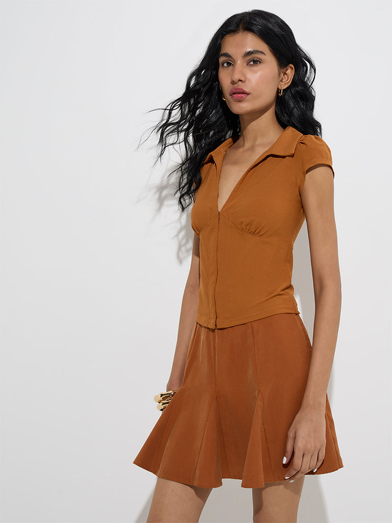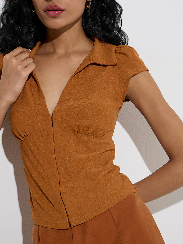 This orange top from Nuon brings a refined edge to everyday styling. Crafted from quality fabric. it features a V-neck collar that leads into a concealed button placket for a streamlined look. Finished with cap sleeves. it’s an easy pick for pairing with tailored pants or denim when you want minimal effort with maximum impact.