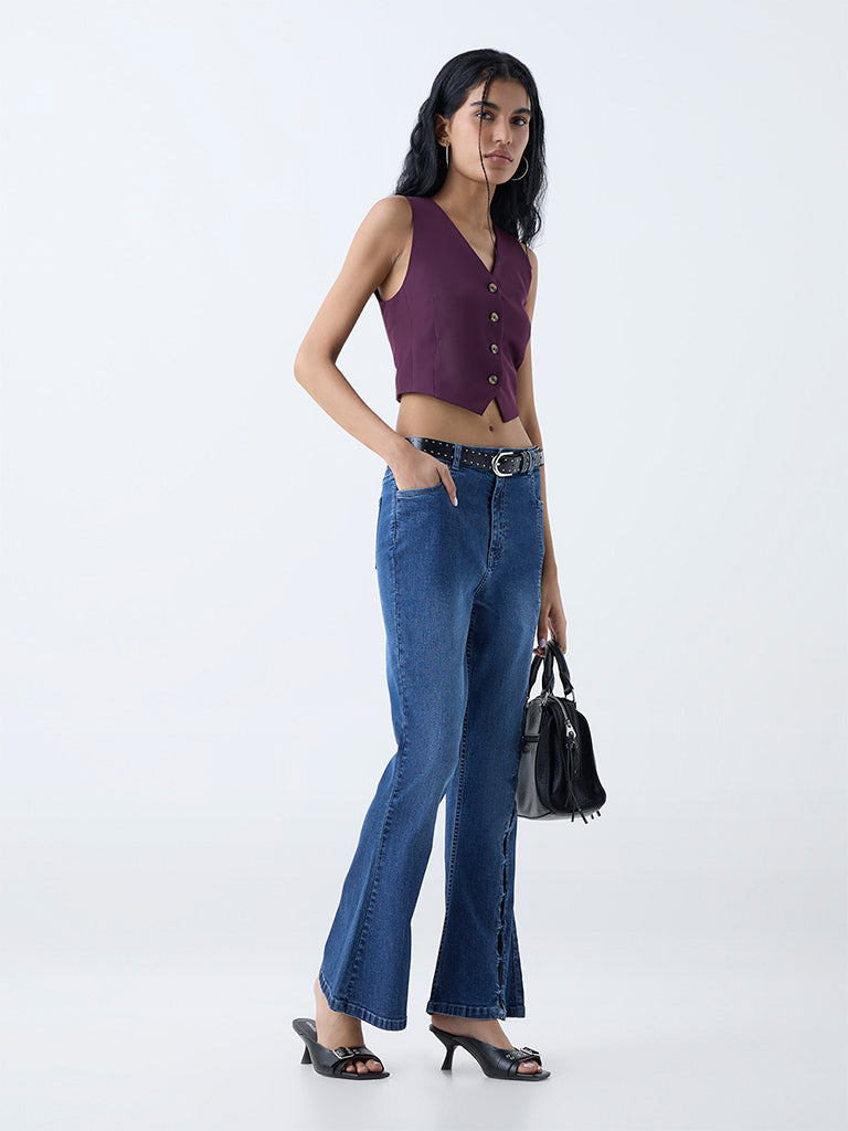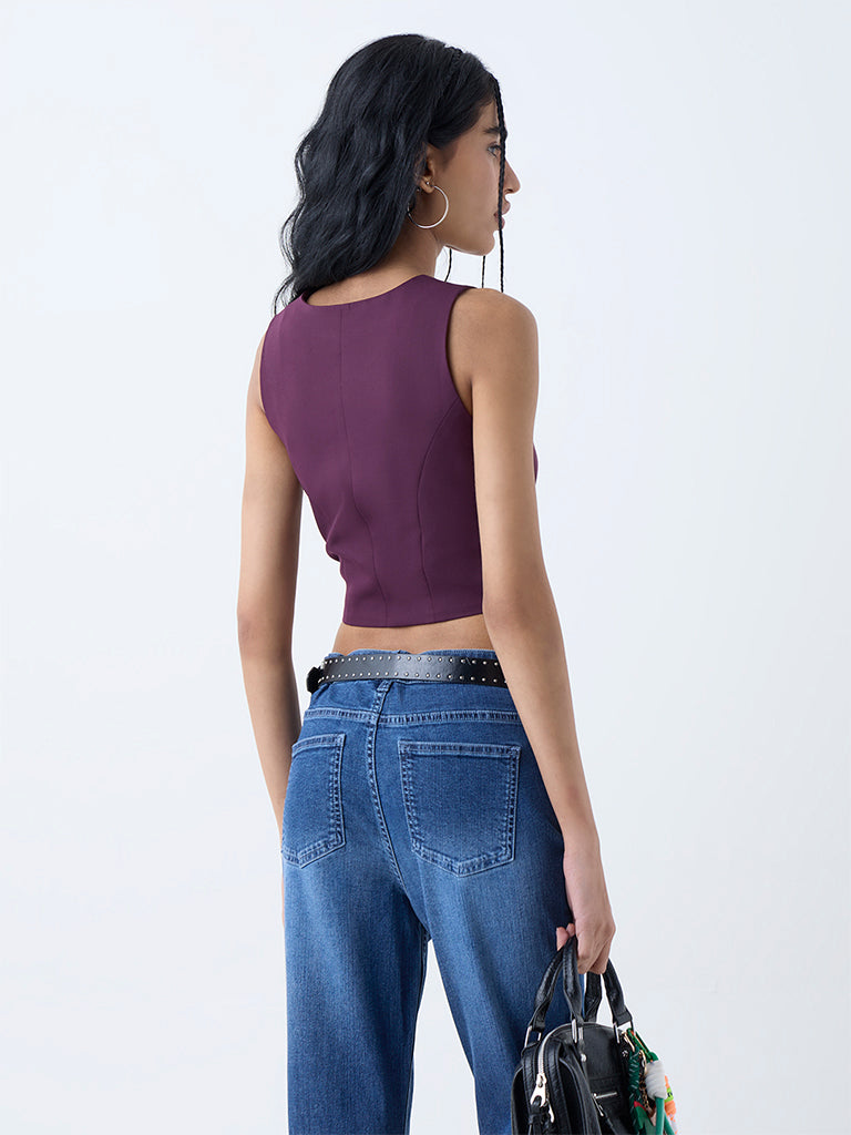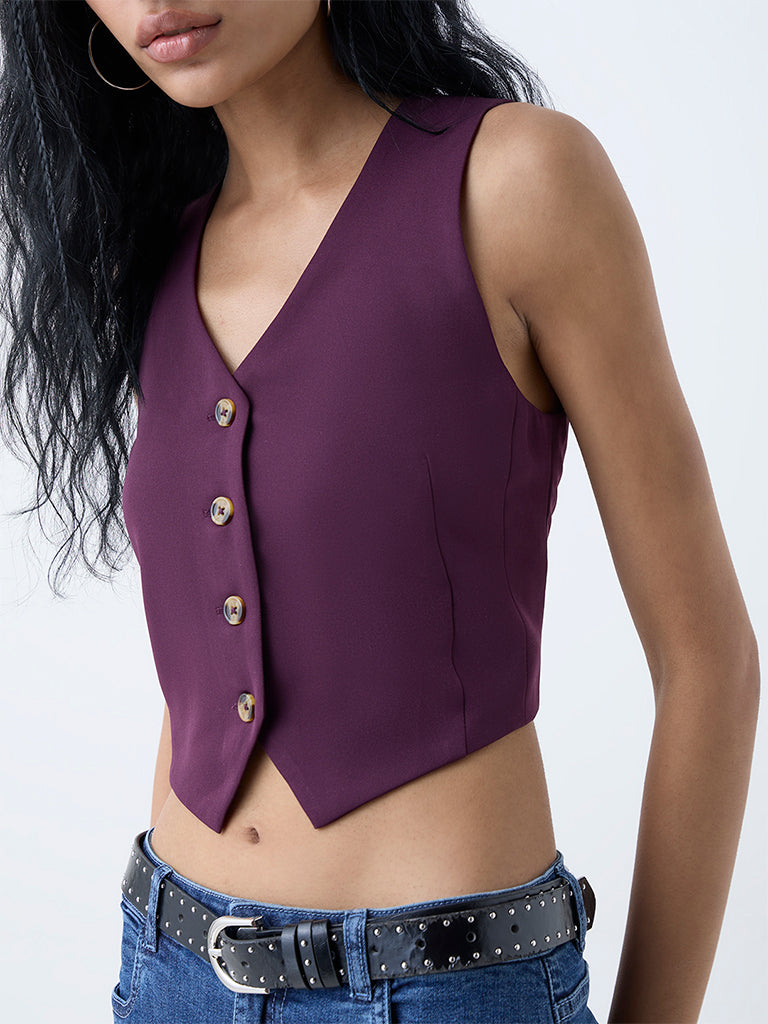 Exude effortless class with this plum solid waistcoat from Nuon. crafted from a lightweight fabric for all-day comfort. The sleeveless design is paired with a V-neckline and button placket. creating a polished edge.