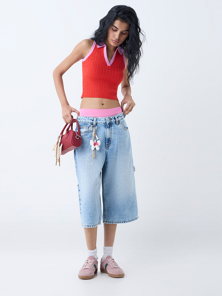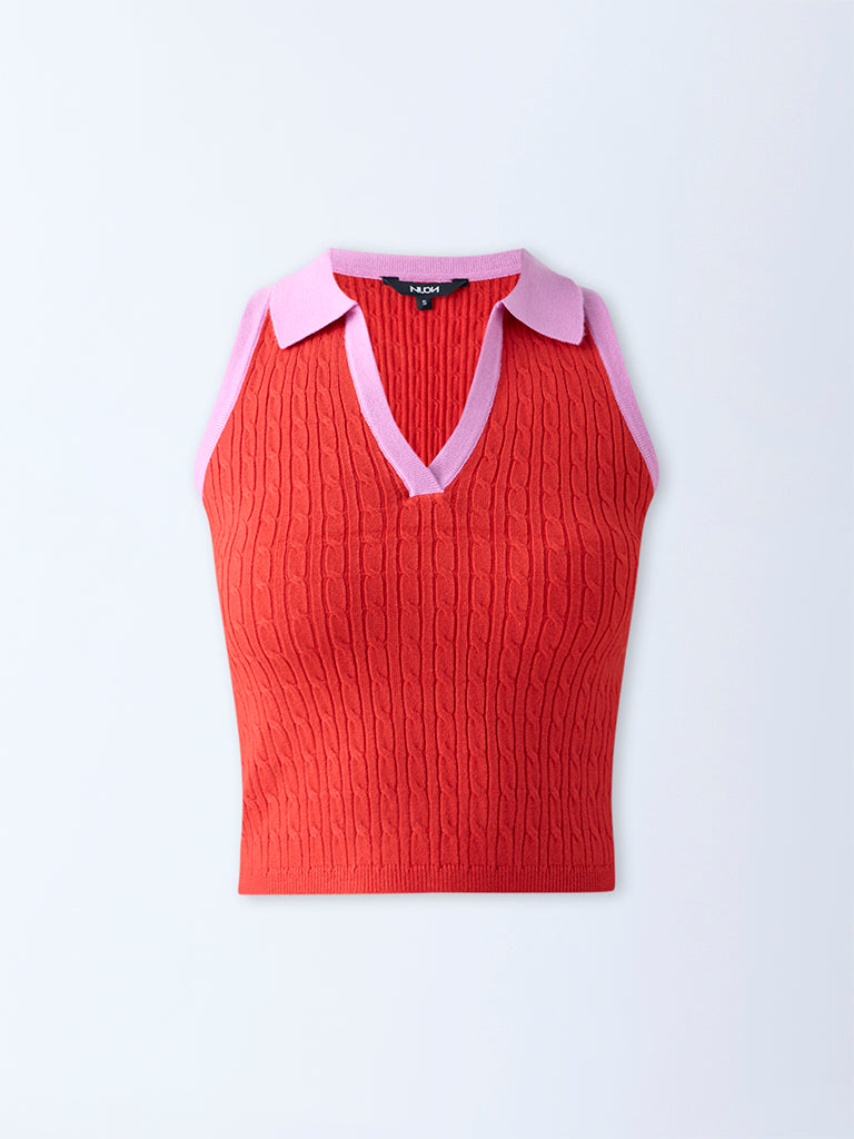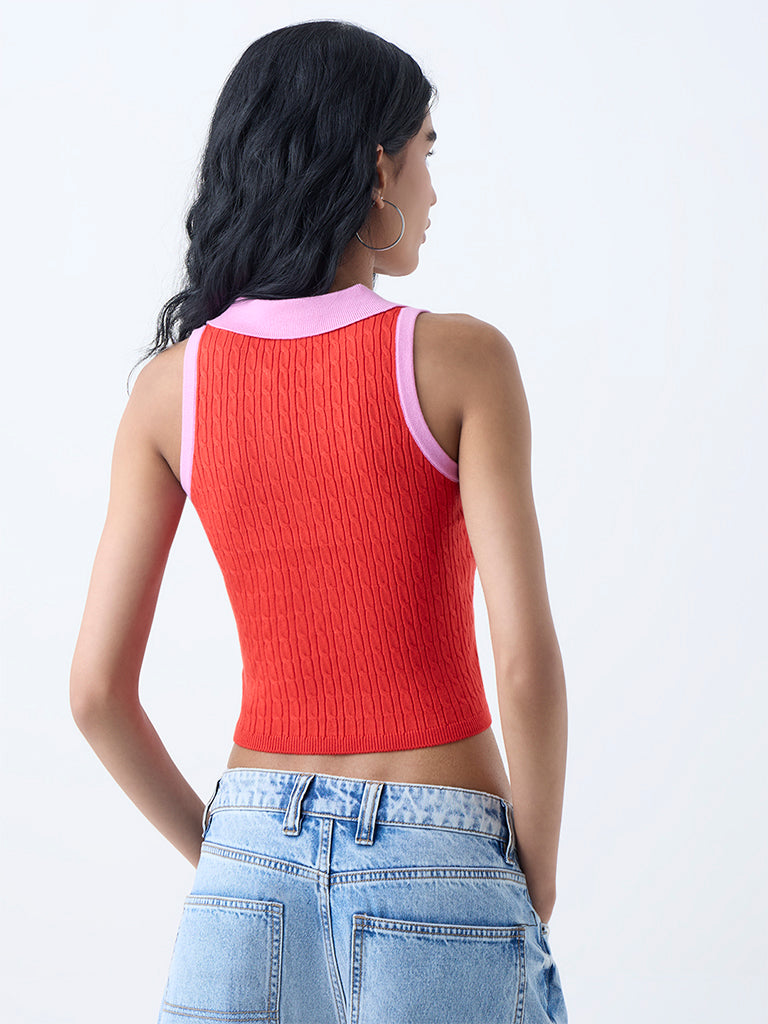 Upgrade your wardrobe staples with this red top from Nuon. Woven from a sumptuous fabric with a contemporary cable-knit texture. it is finished with a V-neck collar and a sleeveless silhouette.