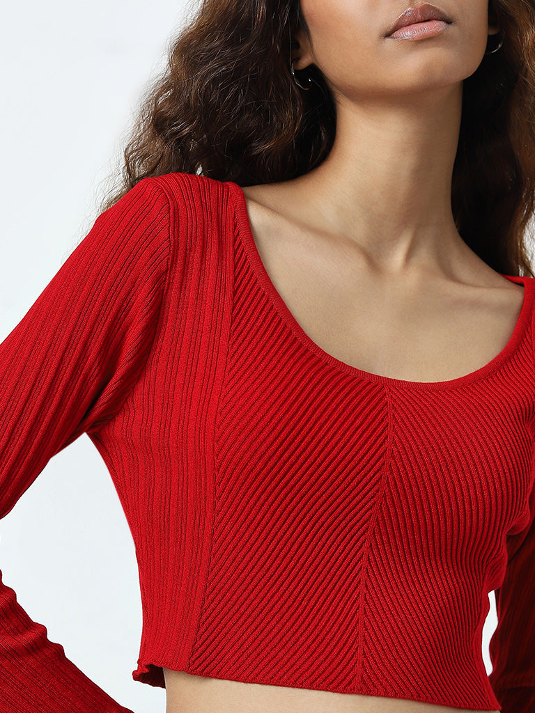This red top from Nuon features ribbed design. Crafted with soft and warm fabric. the winter wear offers a scoop neckline and full sleeves.