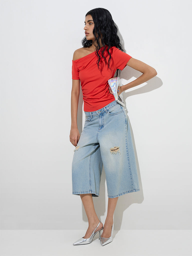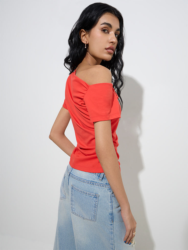 Nuon presents this red top fashioned with ruched detailing on the sides and its short sleeves. Made from soft and stretchable fabric. it boasts a stylish boat neck.