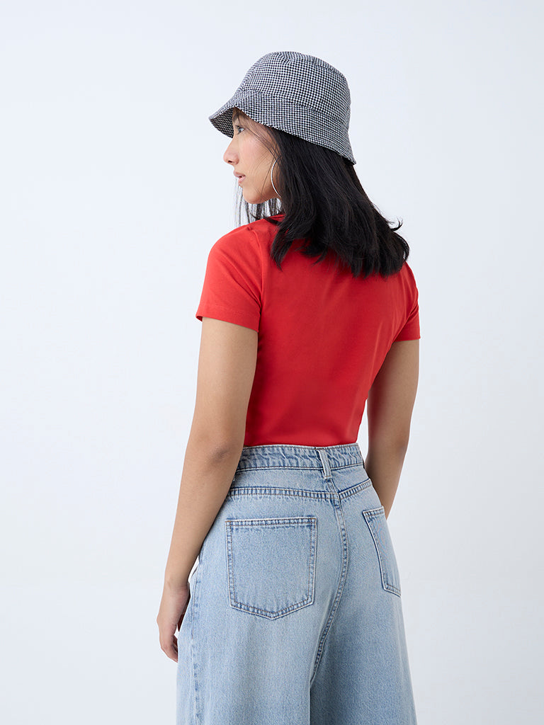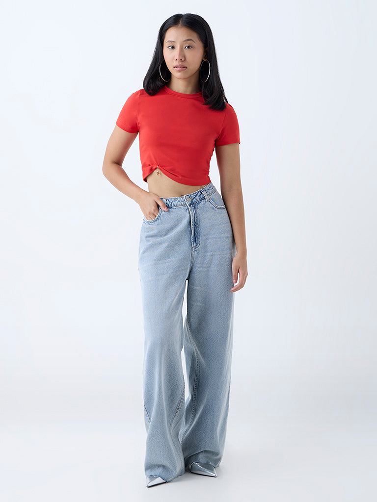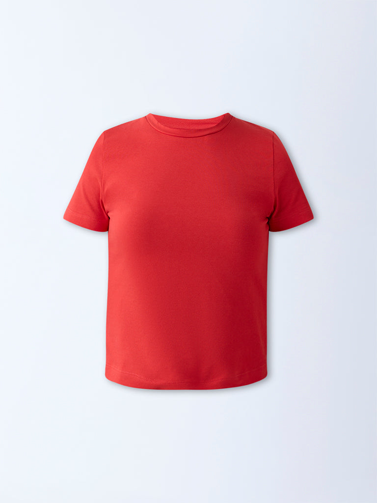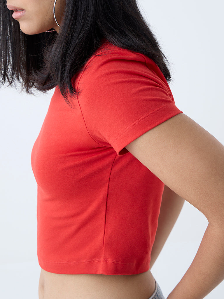 This red crop t-shirt from Nuon is a fresh essential for your off-duty wardrobe. Milled from a soft cotton-blend fabric for all-day comfort. it features a round neckline. short sleeves. and a clean solid finish that pairs effortlessly with everything from denim to joggers.