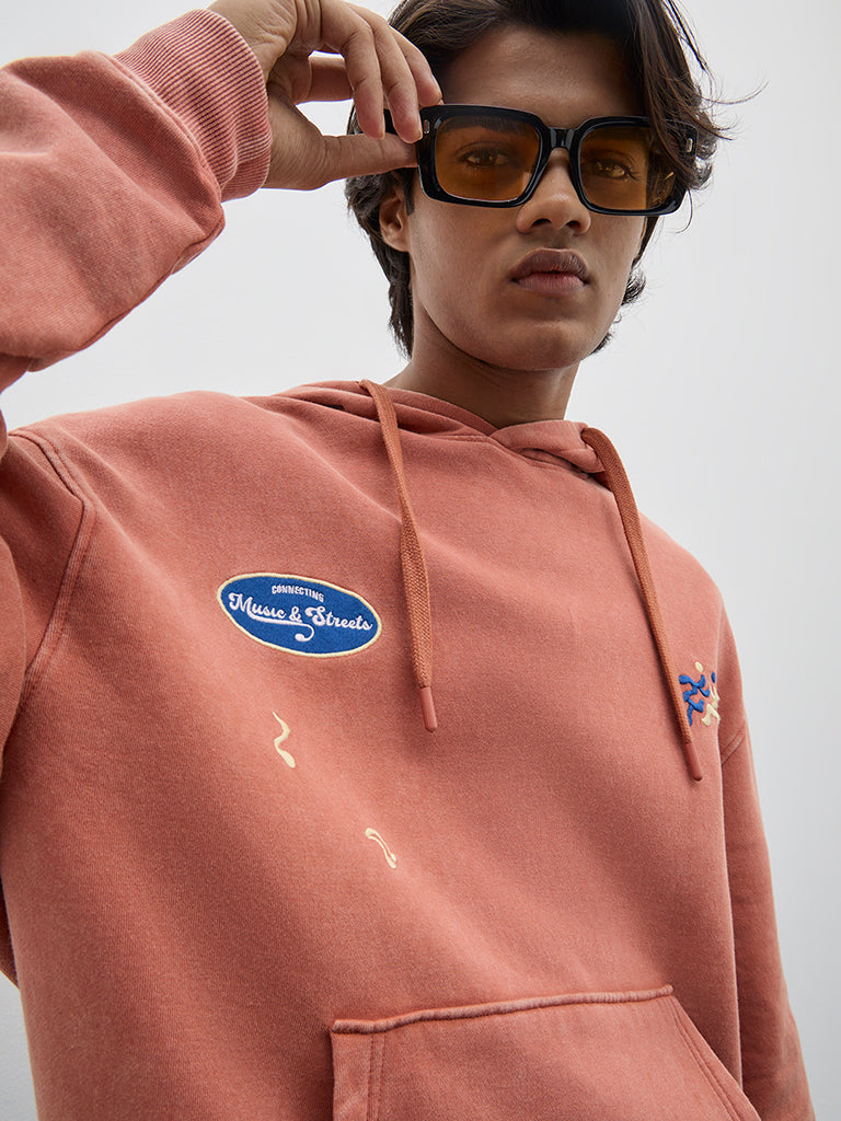 Nuon launches this rust sweatshirt adorned with minimal text embroidery. Presented in a relaxed frame. the cotton-rich garment includes an attached hoodie with adjustable straps. full sleeves and kangaroo pockets.