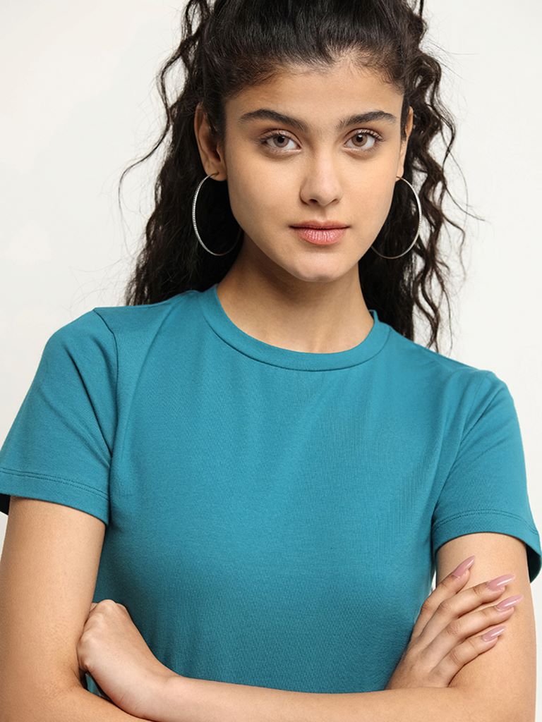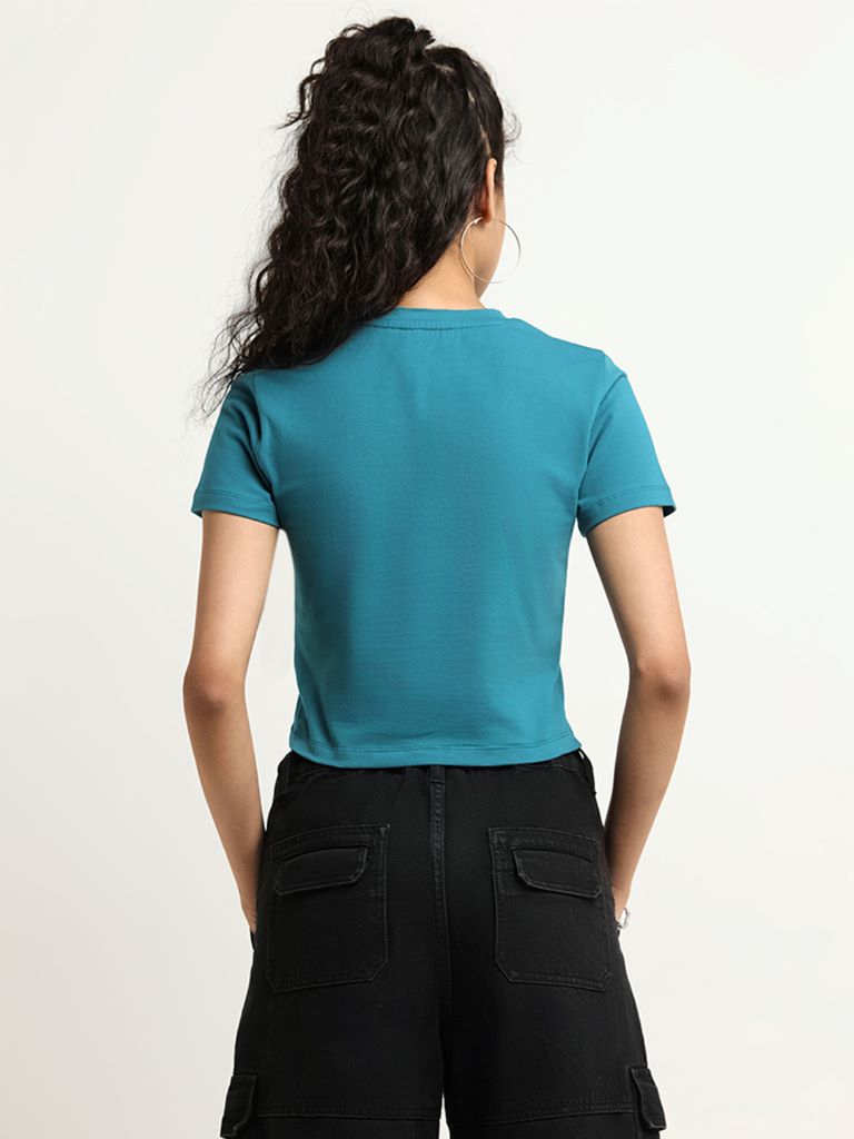 This vibrant teal Nuon t-shirt offers a fresh cropped silhouette. comfortable crew neck. and short sleeves.