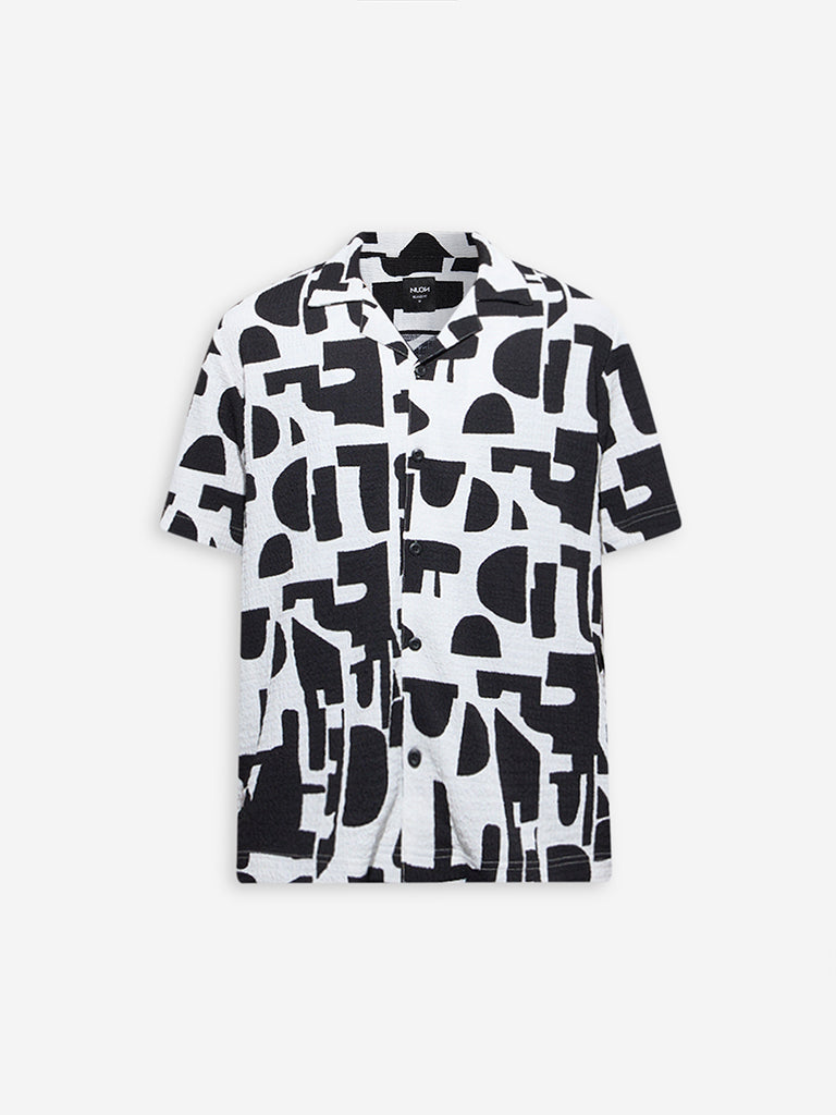 Crafted from a crinkle-textured fabric. this white shirt from Nuon showcases abstract motifs that lend it a contemporary flair. Structured in a relaxed frame. it is styled with a camp collar. a button placket and half sleeves. making it an effortless pick for summer outings.