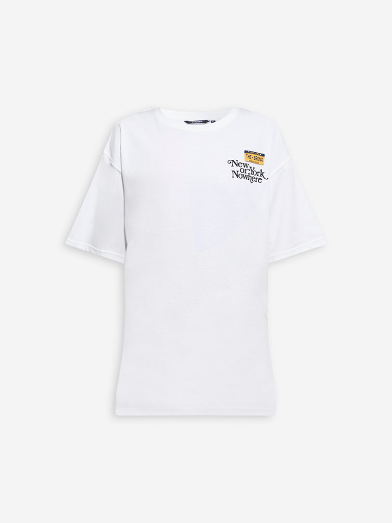 This white tee from Nuon captures a graphic edge with text prints at the front and a striking cityscape design at the back. Created from pure cotton for a super-soft feel. it’s finished with a classic round neck and half sleeves.