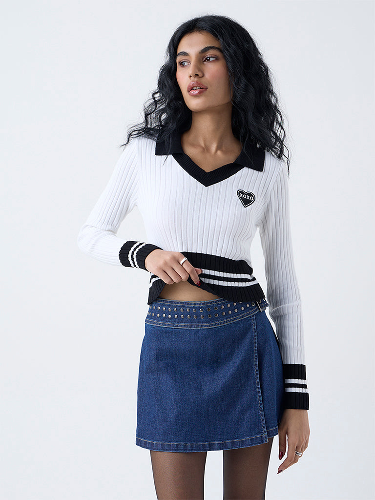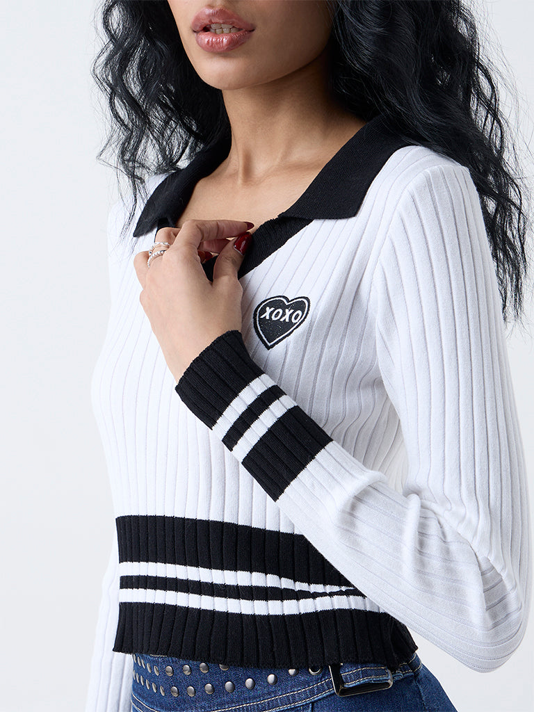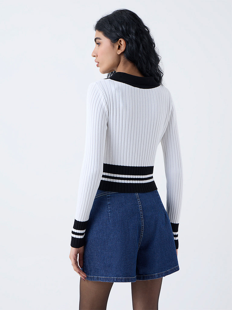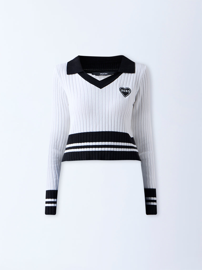 Clean lines and subtle texture define this white colour block top by Nuon. Designed with a V-neck collar and full sleeves. it’s detailed with self-stripes that lend quiet sophistication. A versatile piece that blends comfort with understated style for any casual day out.