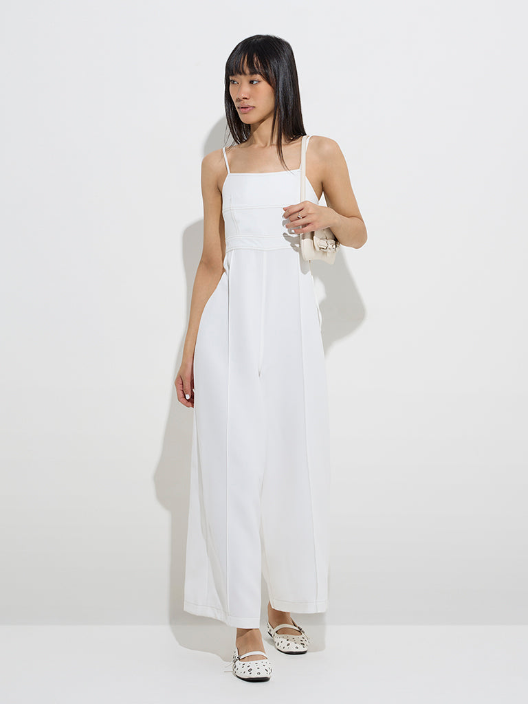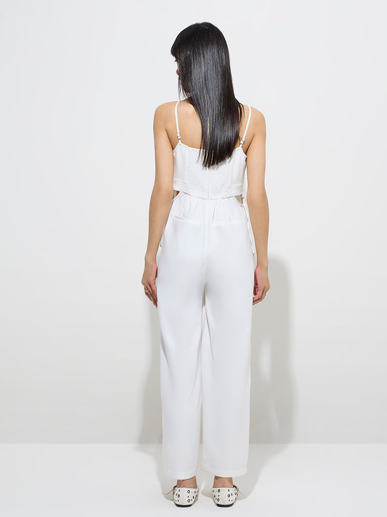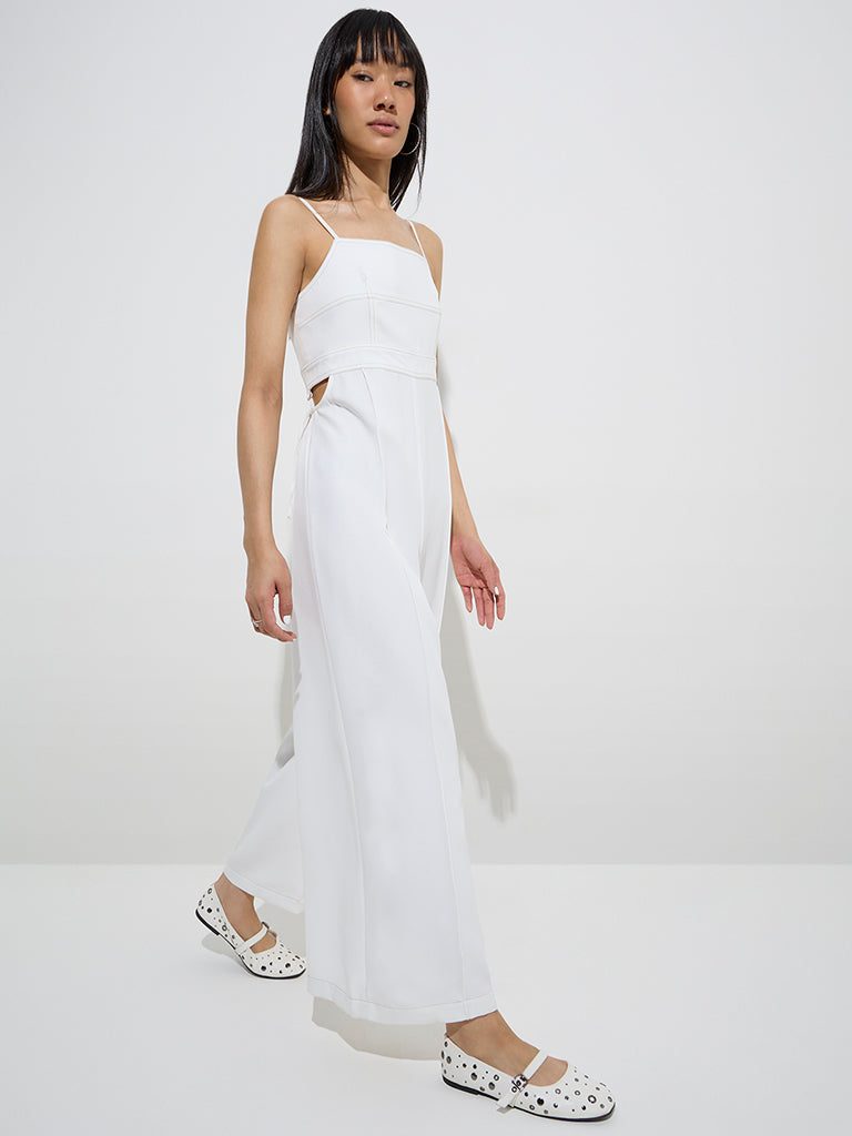 This white solid jumpsuit from Nuon is spun from a breathable fabric for all-day comfort. Designed with a square neckline and a sleeveless cut. it features cut-out detailing at the sides. Functional side pockets add a practical touch to the design.