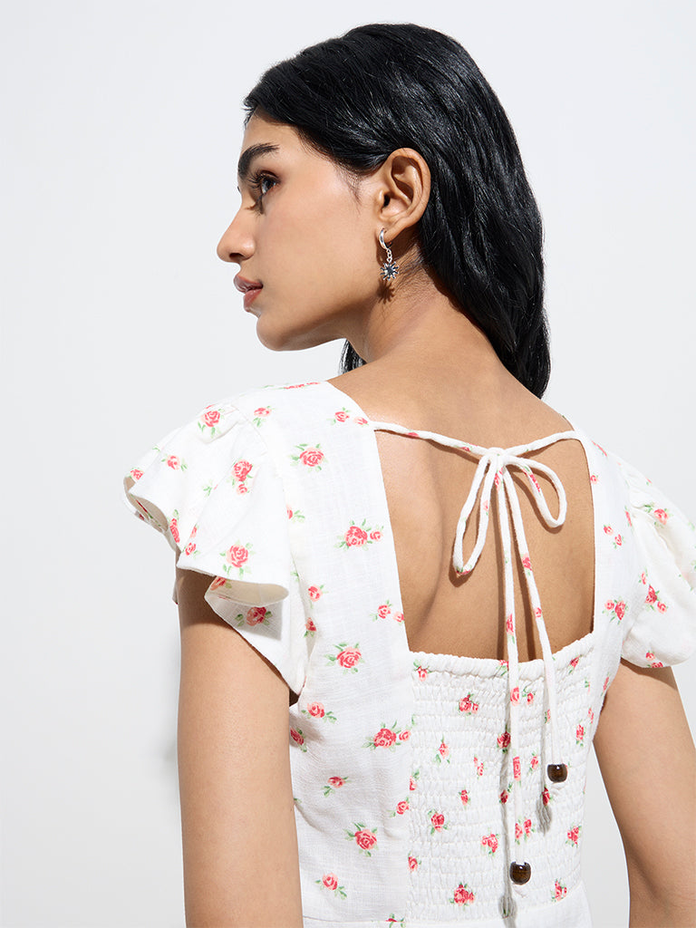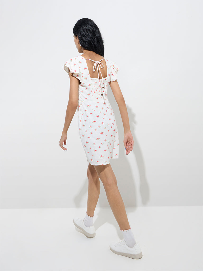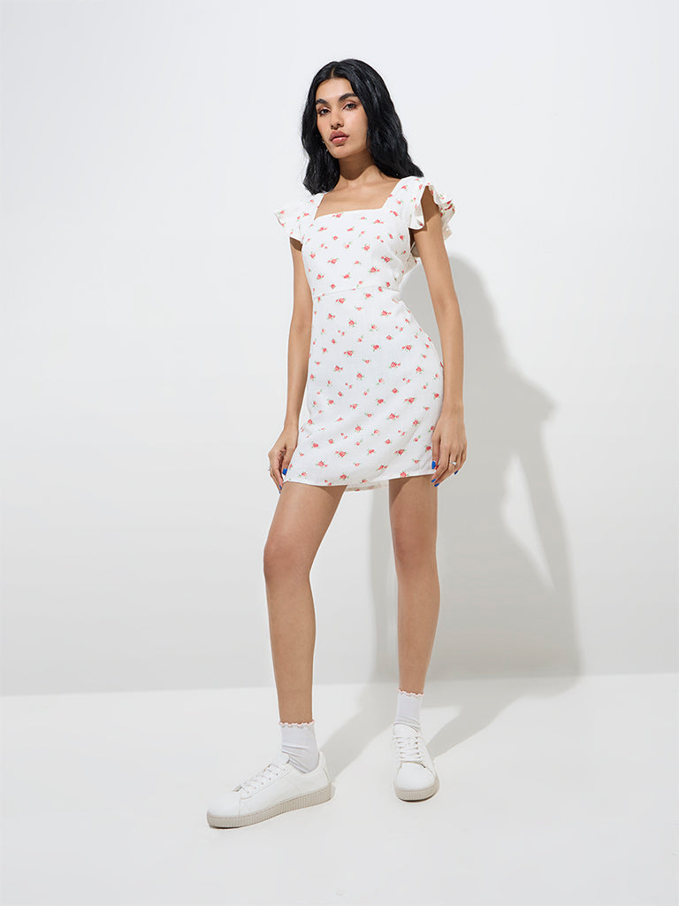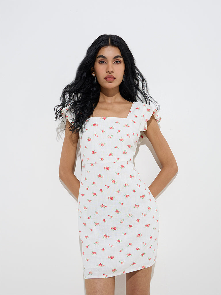 This white dress from Nuon is crafted from a luxurious linen-blend fabric and adorned with delicate floral motifs. Designed with a square neckline and ruffled sleeves. it features a smocked back and a tie-up detail for a secure fit. while its bodycon silhouette enhances the feminine charm.