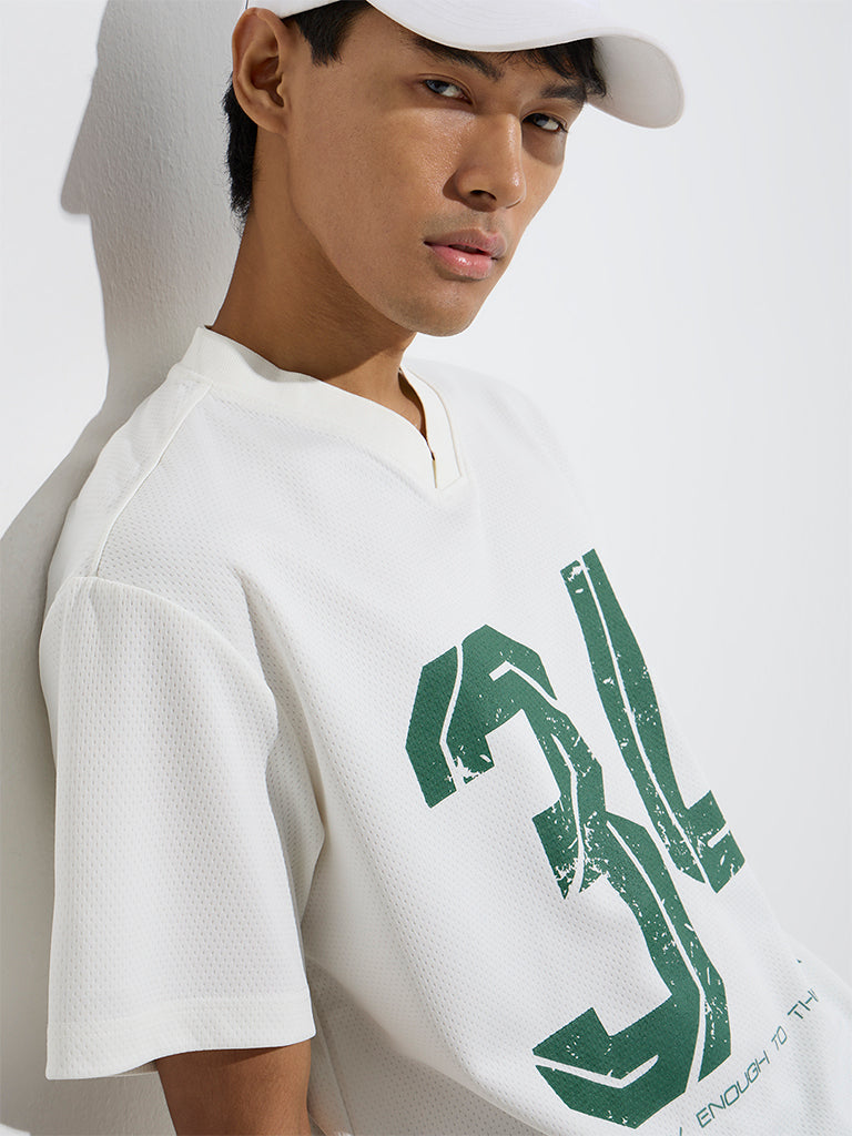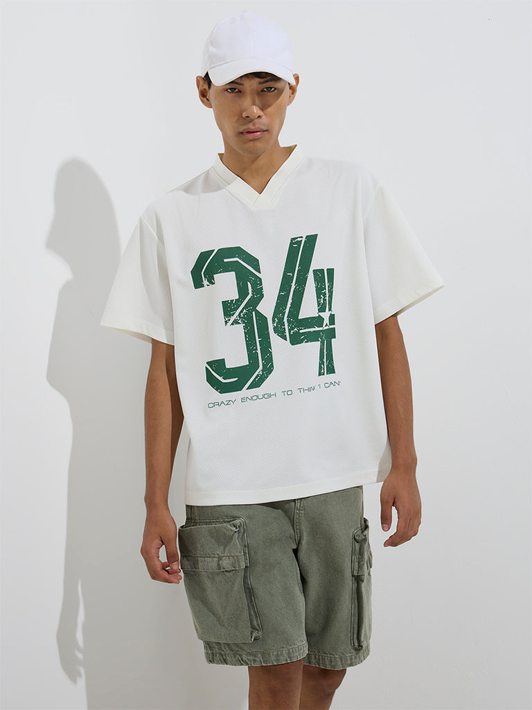 This white tee from Nuon channels classic jersey styling with a modern twist. Cut in a relaxed fit from a breezy fabric. it flaunts bold numerical prints that add a sporty edge. Finished with a V-neck and half sleeves. it’s a versatile choice for your weekend getaways.