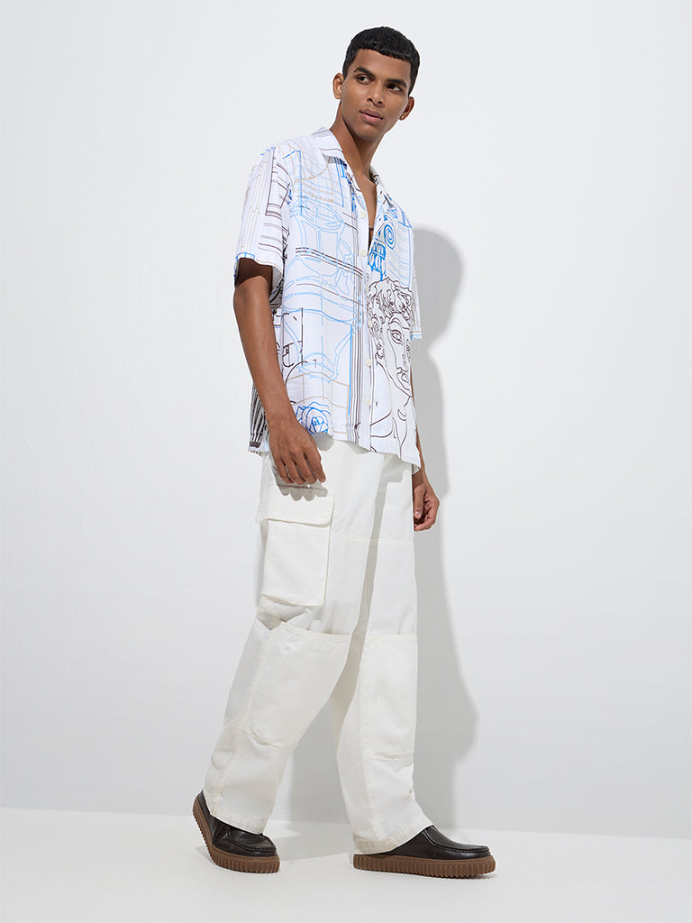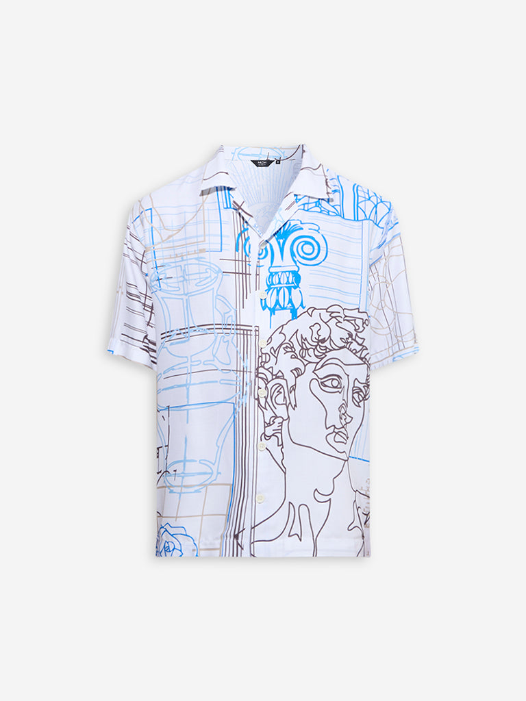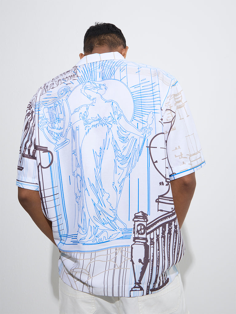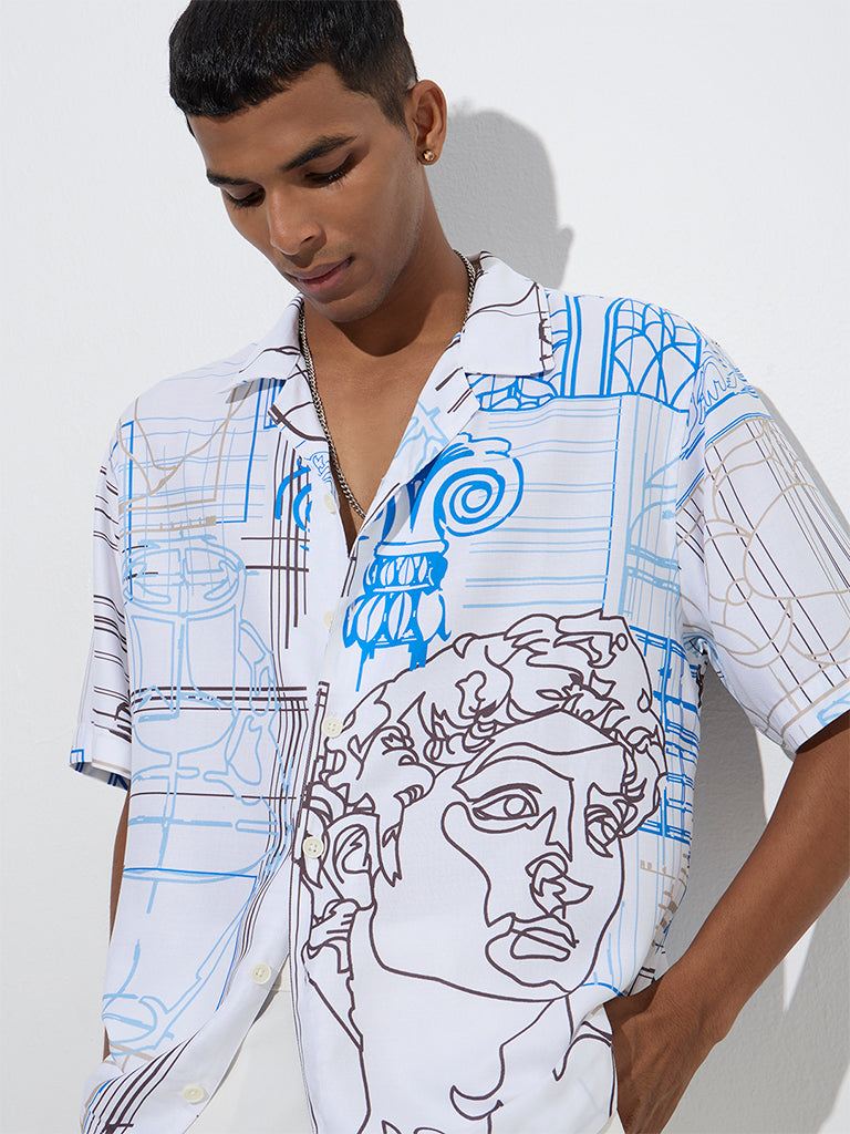 This white shirt from Nuon showcases artistic Greek-inspired prints across a relaxed silhouette. bringing a creative edge to your casual wardrobe. Created from a lightweight fabric. it features a camp collar. a button placket. and half sleeves. making it a breezy yet stylish choice for warm-weather styling.