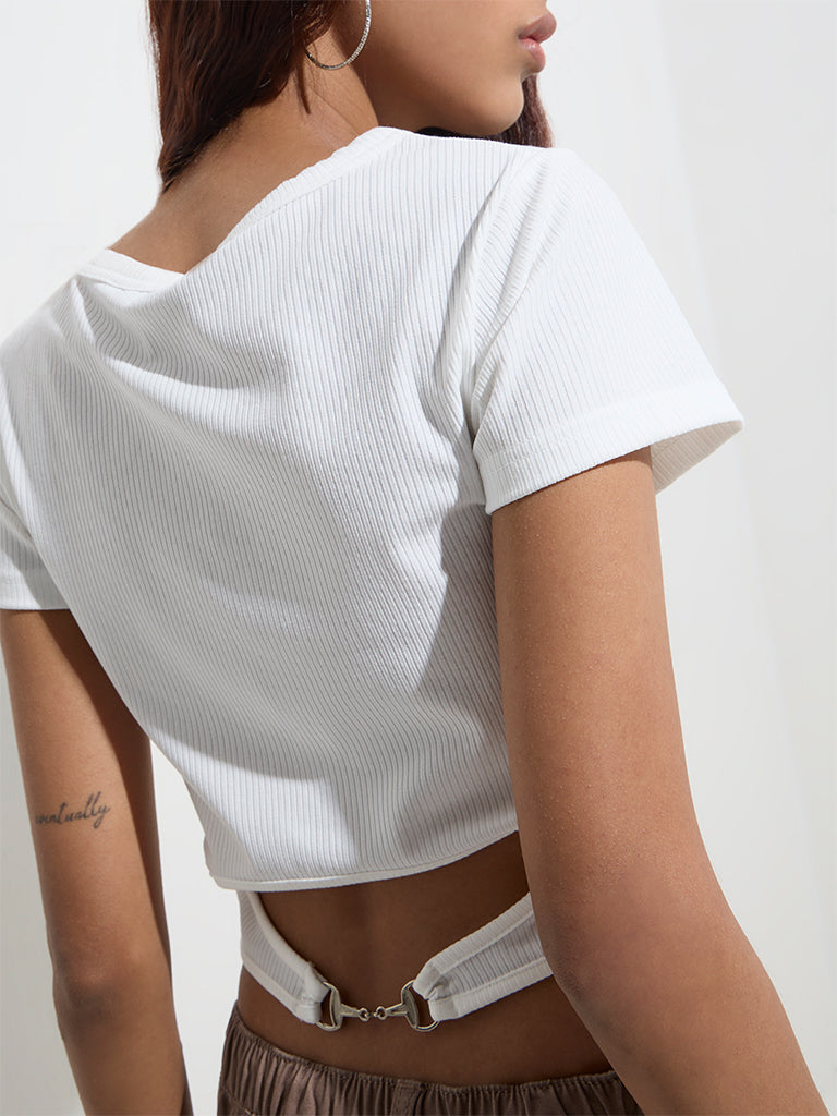 Nuon White Ribbed Cut-Out Detailed Crop T-Shirt