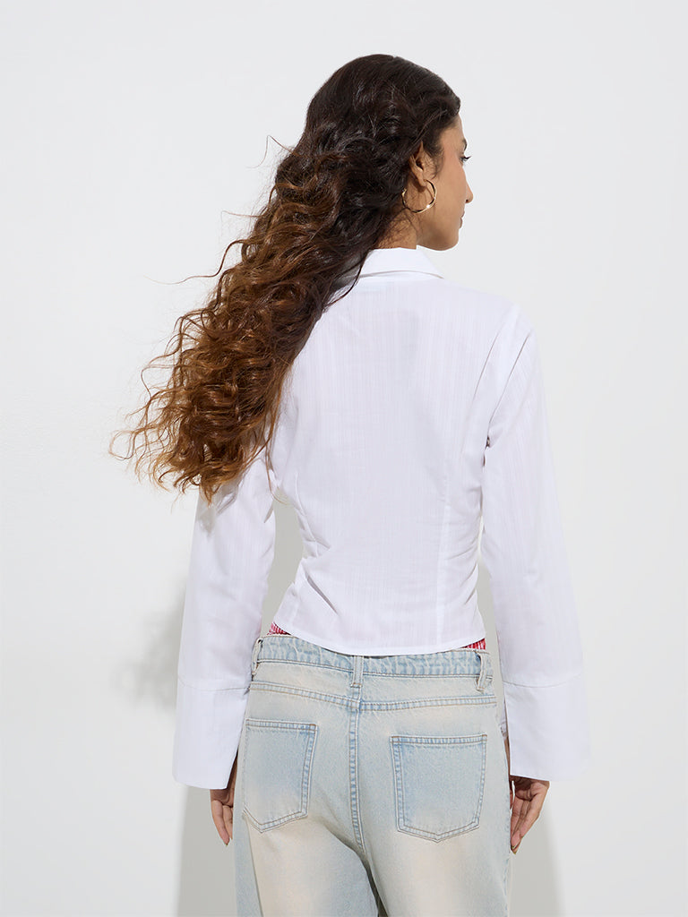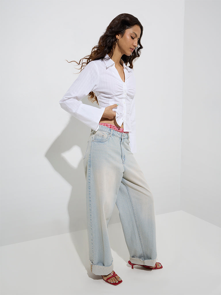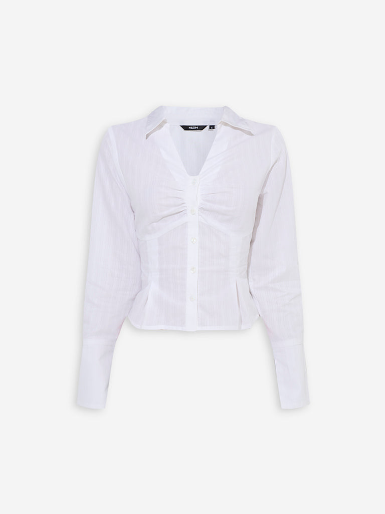 This white shirt from Nuon showcases self-striped patterns on a pure cotton base. blending texture with effortless style. Designed with a V-neck collar that flows into a button placket and full sleeves. it features ruched detailing on the bodice for a flattering touch.