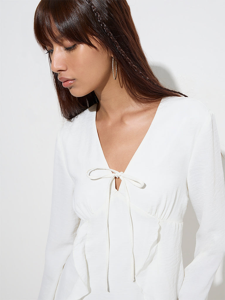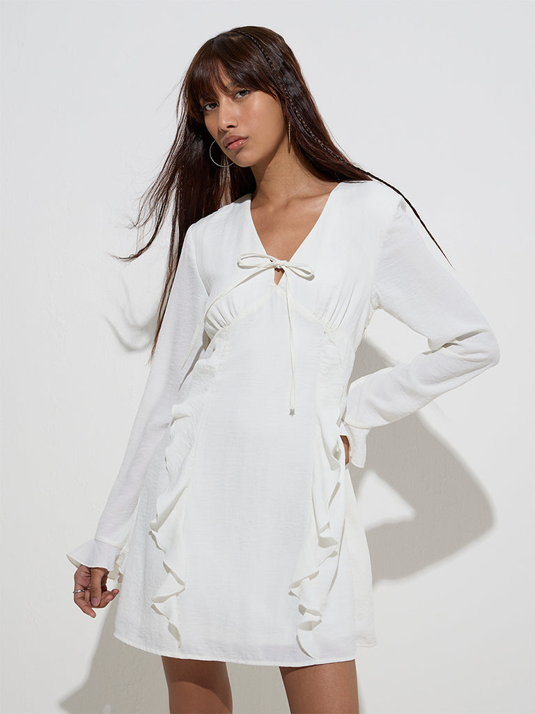 This white dress from Nuon is sculpted in an A-line silhouette for effortless elegance. Featuring a flattering V-neck and graceful flute sleeves. it is accented with ruffle detailing along the front and sleeves. while a delicate tie-up at the front adds a charming touch.