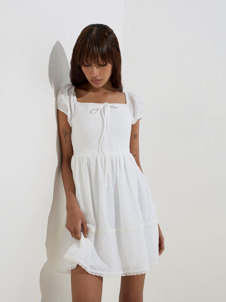 Breezy and charming. this white dress from Nuon is tailored from pure cotton in a flattering A-line silhouette. The square neckline and smocked bodice offer both style and comfort. while the Swiss-dot embroidery and tie-up detail lend a delicate finish.