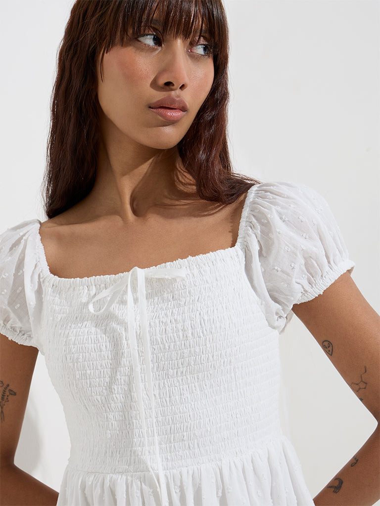 Nuon White Smocked Cotton A-Line Dress