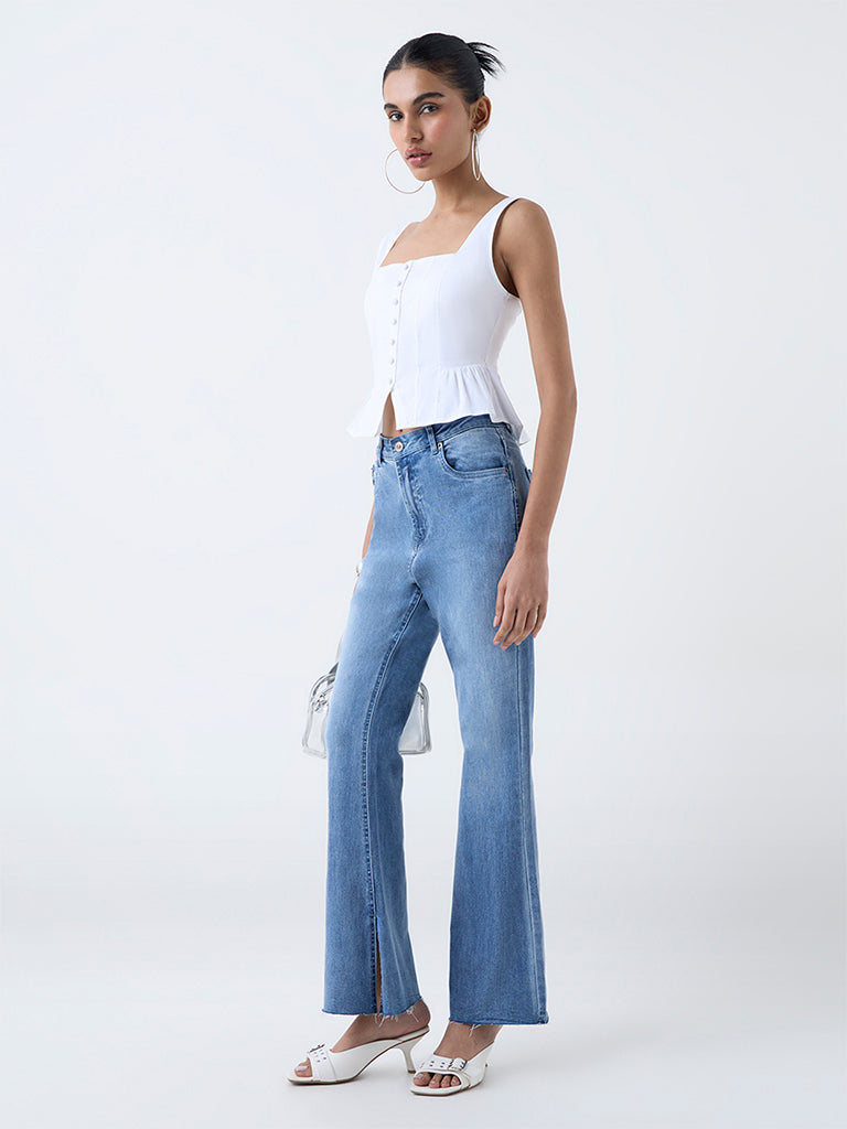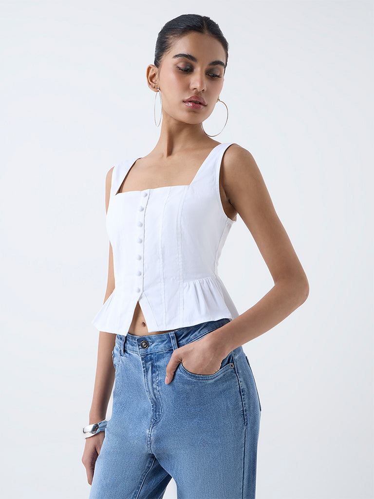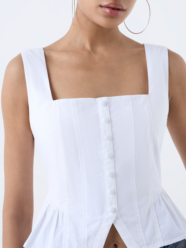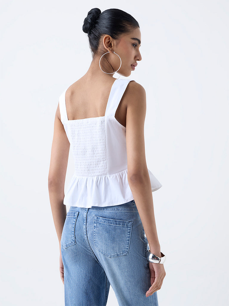 Fresh and feminine. this white top from Nuon is cut with a square neck and sleeveless profile for a breezy vibe. The smocked back keeps it easy. while the flared hem creates a subtle peplum shape. A clean. versatile piece that pairs effortlessly with high-rise denim.
