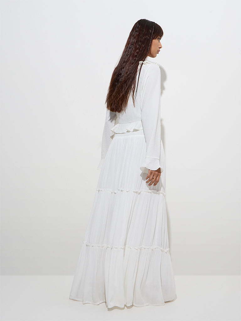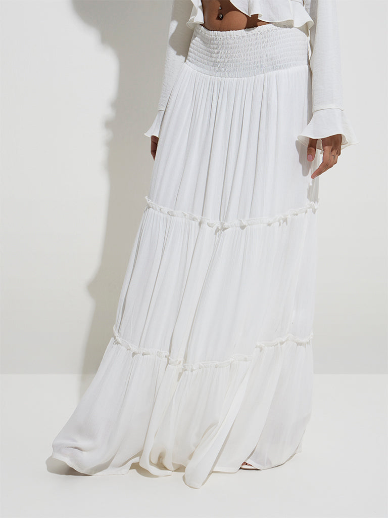 Shaped in a tiered silhouette. this white skirt from Nuon is crafted from a breathable fabric for effortless comfort. Designed with a high-rise fit. it features a smocked elasticated waist for a flexible and secure feel.