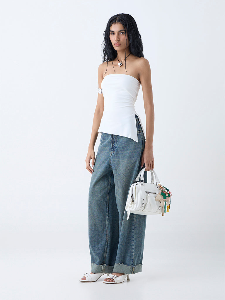 Boost your summer wardrobe with this white tube top from Nuon. Crafted from stretch-infused fabric. it sits comfortably against the skin while allowing natural movement. The off-shoulder neckline features a smooth elastic band for a secure fit. and a side slit adds a flattering twist.