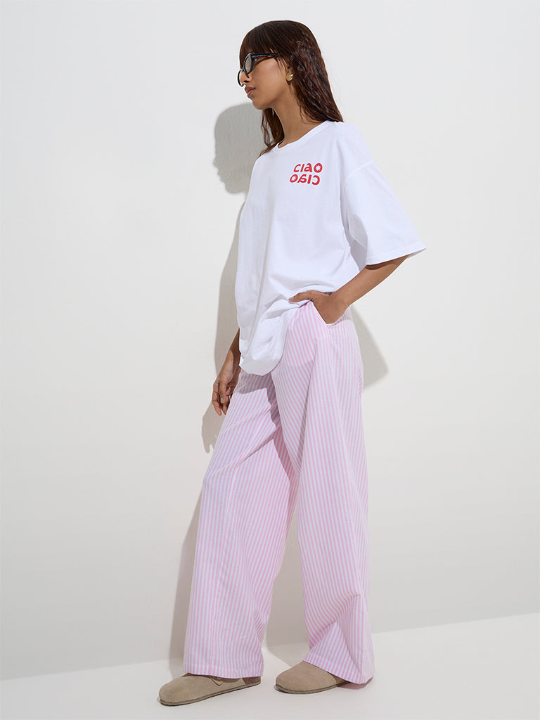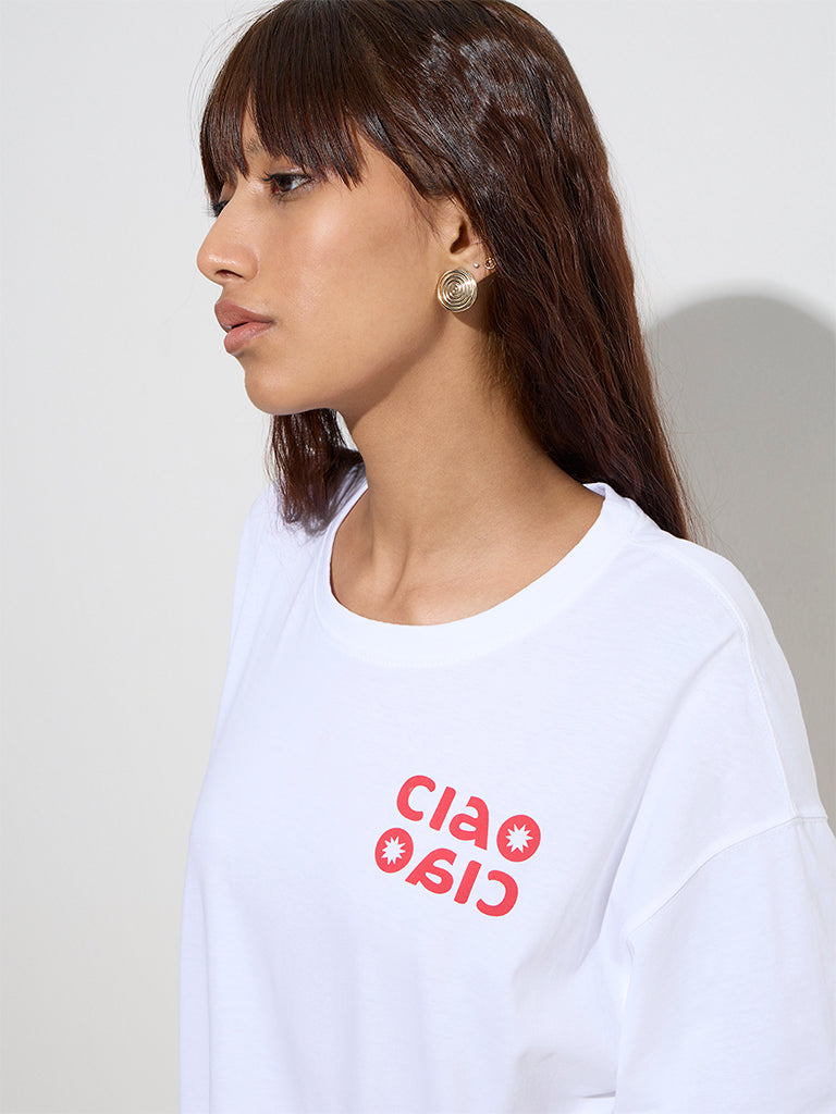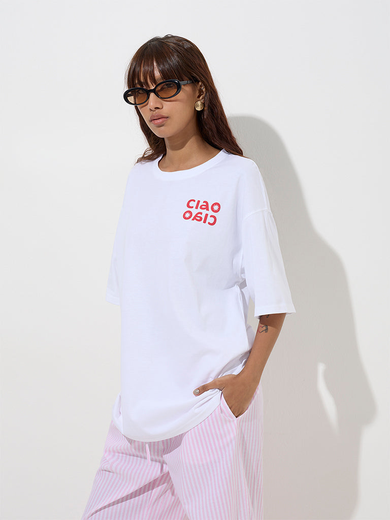 This white oversized tee from Nuon is made from a cotton-rich fabric and styled with a round neck and short sleeves for easy wear. The text print across the front adds a punch of personality. making it a versatile staple with a laid-back. expressive vibe.