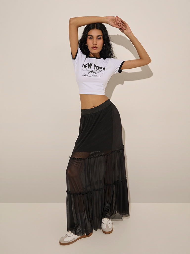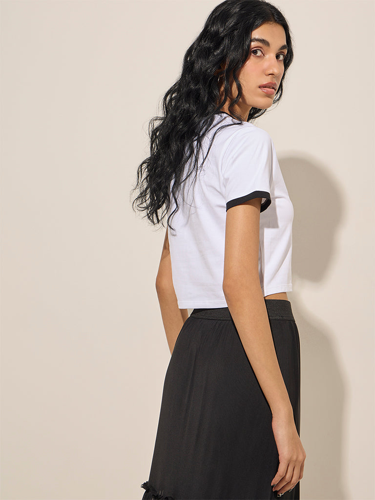 Nuon unveils this white crop t-shirt featuring funky text prints. Made with pure cotton. it displays a bordered crew neck and short sleeves.