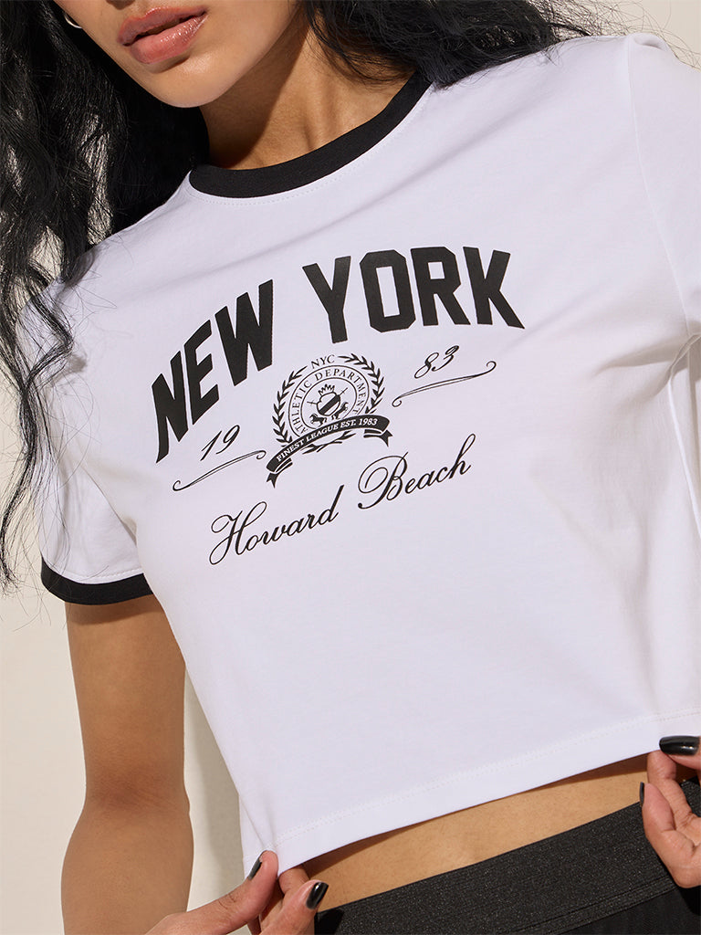 Nuon White Text Printed Cotton-Blend Crop T-Shirt