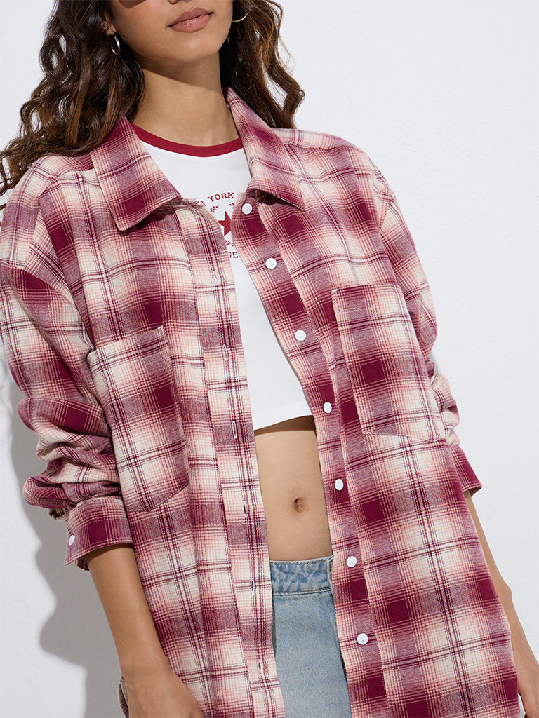 This wine shirt from Nuon highlights a classic checkered pattern. Milled from pure cotton for all-day comfort. it’s designed with a spread collar. full sleeves. a button placket. and a handy chest pocket.