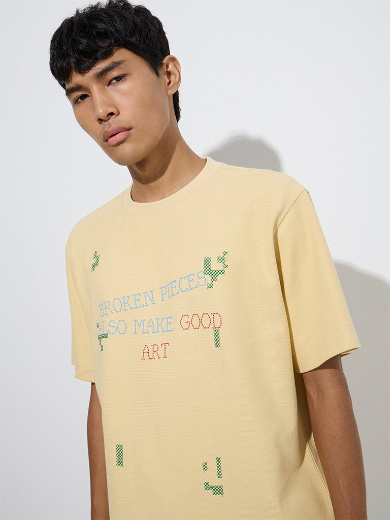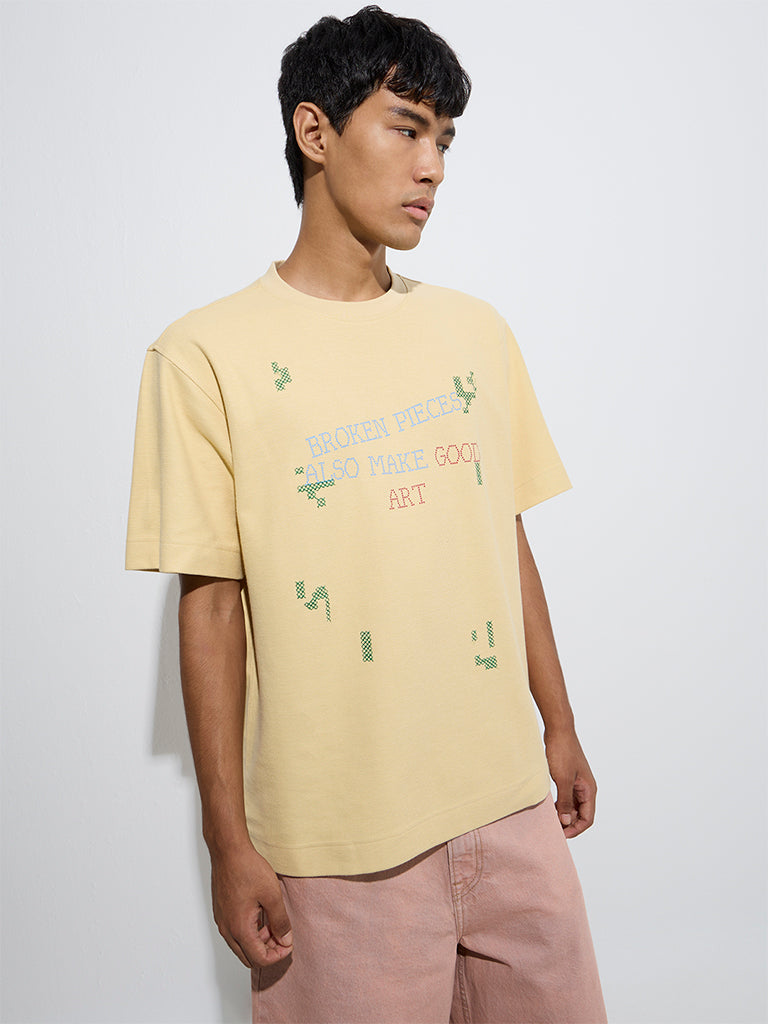 Nuon presents this yellow t-shirt crafted from pure cotton for a comfortable fit. Featuring embroidered detailing. it offers a relaxed frame. crew neckline. and half sleeves for a casual. effortlessly stylish look.